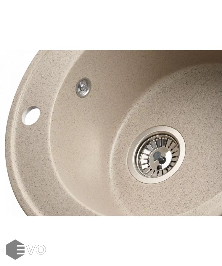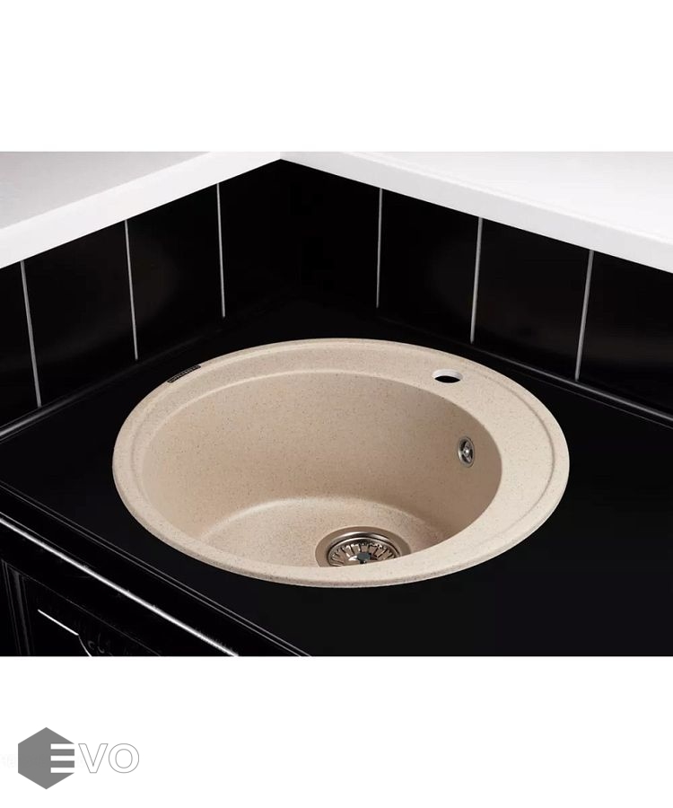 Изделие выполнено из искусственного гранита, который отличается прочностью, долговечностью, гигиеничностью и устойчивостью к влаге и химическим веществам. В комплект поставки входят отводная арматура с сифоном и корзинчатым вентилем.