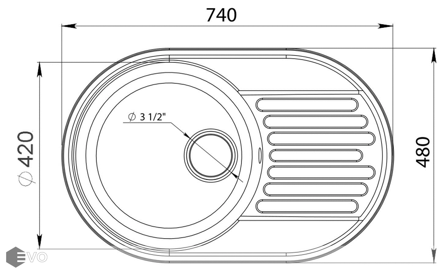 Овальная кухонная мойка предназначена для врезки в столешницу, размеры изделия (ВxШxГ): 18x74x48 см. Вместительная чаша глубиной 18 см удобна в эксплуатации, поскольку дает возможность комфортно мыть довольно крупную посуду. Крыло оборачиваемой модели может быть повернуто во время установки в правую или левую сторону (отверстие под смеситель высверливается в зависимости от его положения). В комплекте поставляются выпуск с переливом и гофрированная трубка между ними, а также необходимые резиновые уплотнители, диаметр сливного отверстия — 9 см.