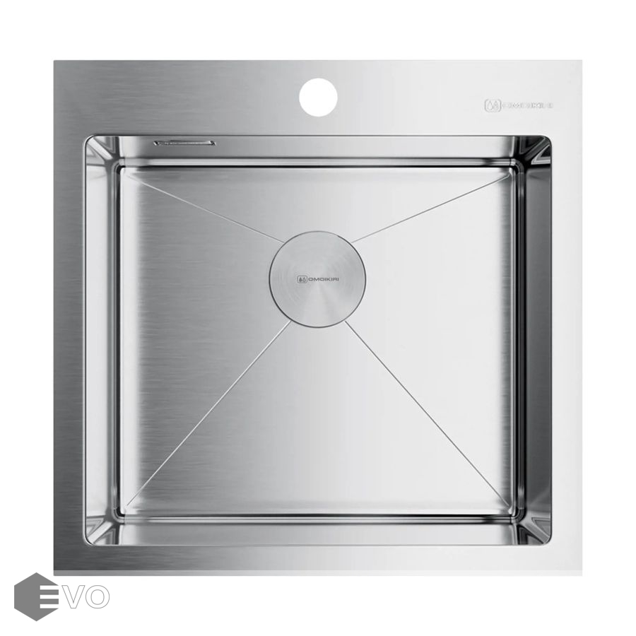 Современная и практичная мойка, произведенная вручную из японской высококачественной хромоникелевой нержавеющей стали OMOIKIRI Akisame 51-IN с плоским кантом доступна для врезного монтажа и монтажа вровень со столешницей.