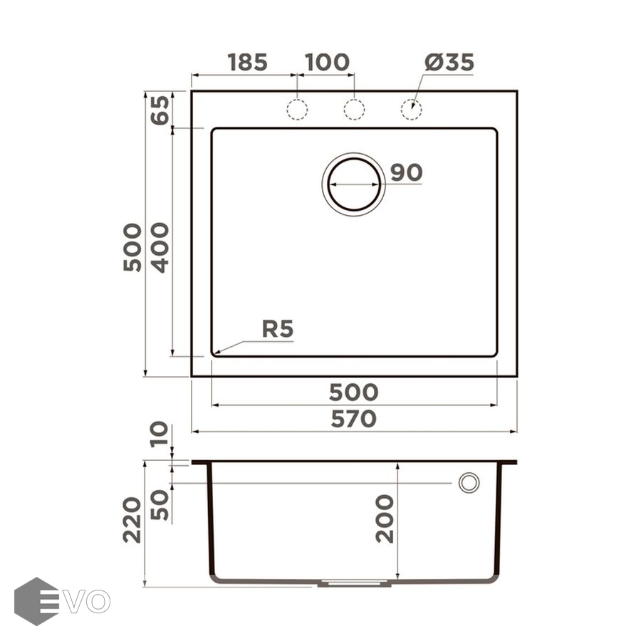 - Размер мойки 570x500