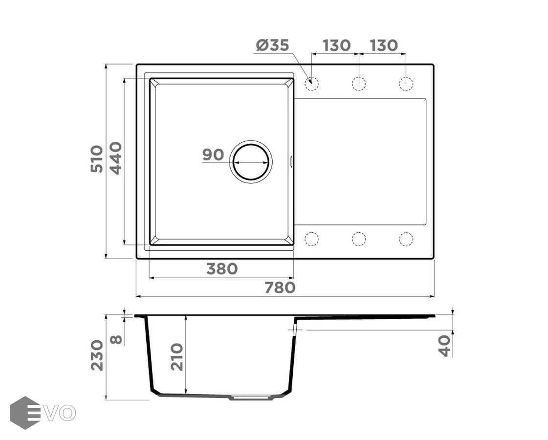 - Размер мойки: 780x510 мм