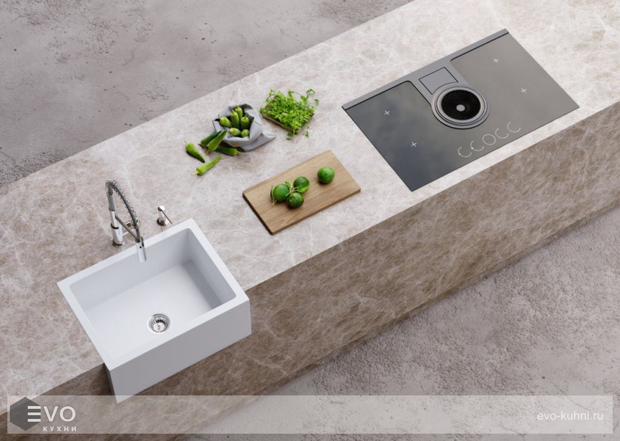 Монтируется с открытой фронтальной стенкой, можно выбрать плоскую или рифленую сторону (каннелюры выполнены в виде вертикальных углублений). Видимая передняя сторона может быть расположена вровень с фасадом кухонного гарнитура или выступать вперед.