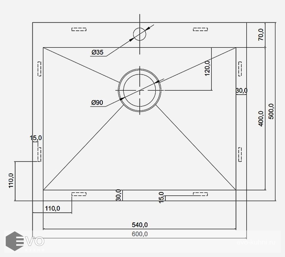 - Длина мойки: 600