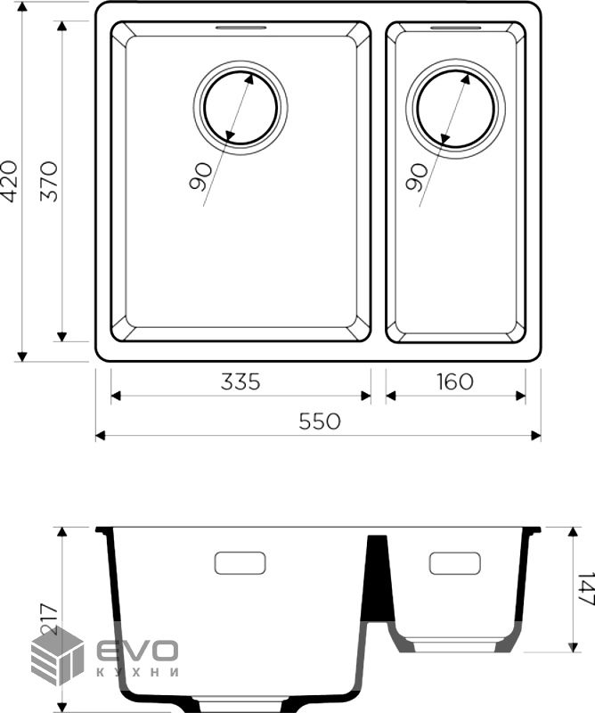 • Размер выреза под мойку: 510х370 мм., угловой радиус врезки 12 мм.