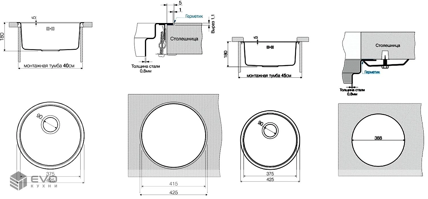 • Мойка может устанавливаться 2-мя способами: под столешницу и как обычная врезная мойка;