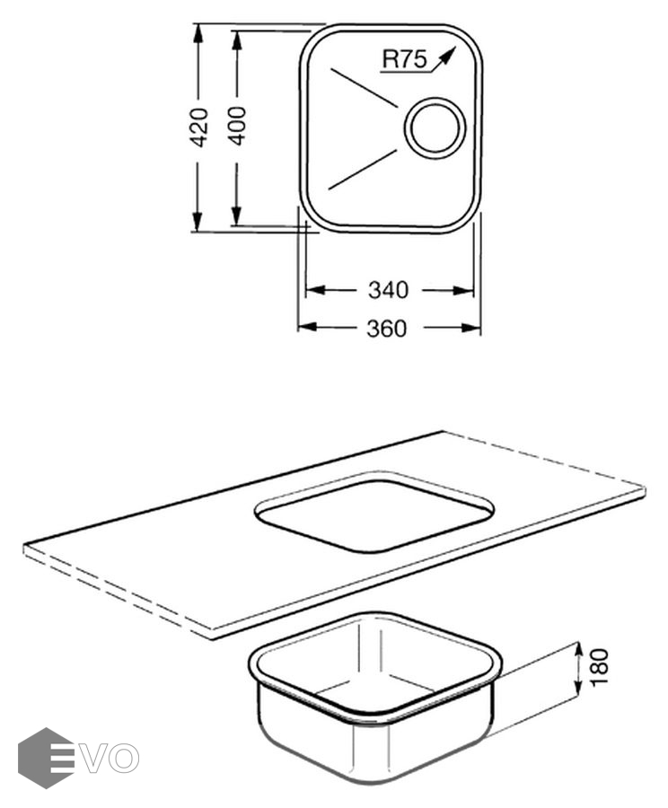 - Радиус скругления мойки: 75 мм