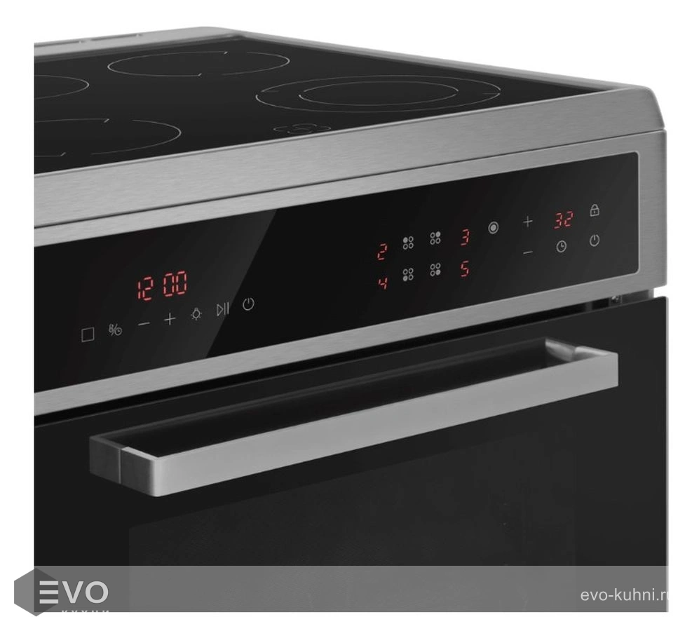 Функции плиты : Автоотключение Блокировка панели управления Индикатор остаточного тепла Контурная конфорка Овальная зона нарева