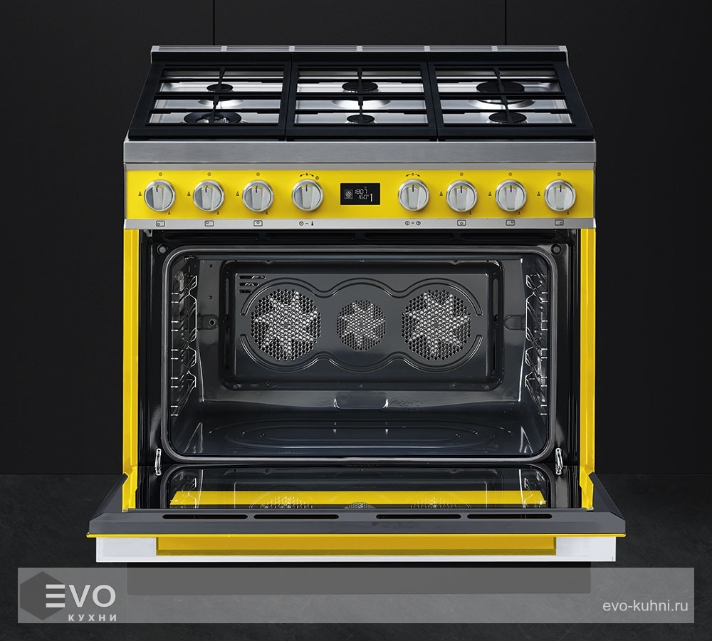 Плита кухонная Smeg CPF9GPYW – плита с системой закрывания Soft Close, комбинированный вариант газовой поверхности и электрического духового шкафа. Эта модель многофункциональна – на поверхности расположены 6 горелок разного размера и мощности с электроподжигом и контролем утечки газа.