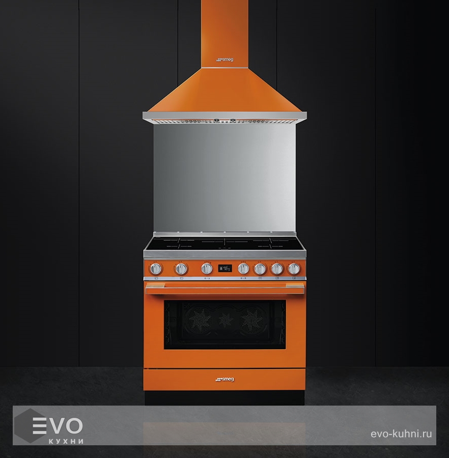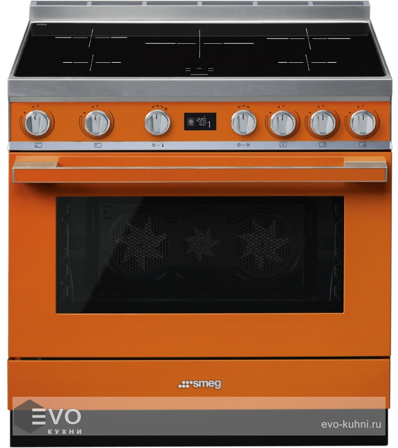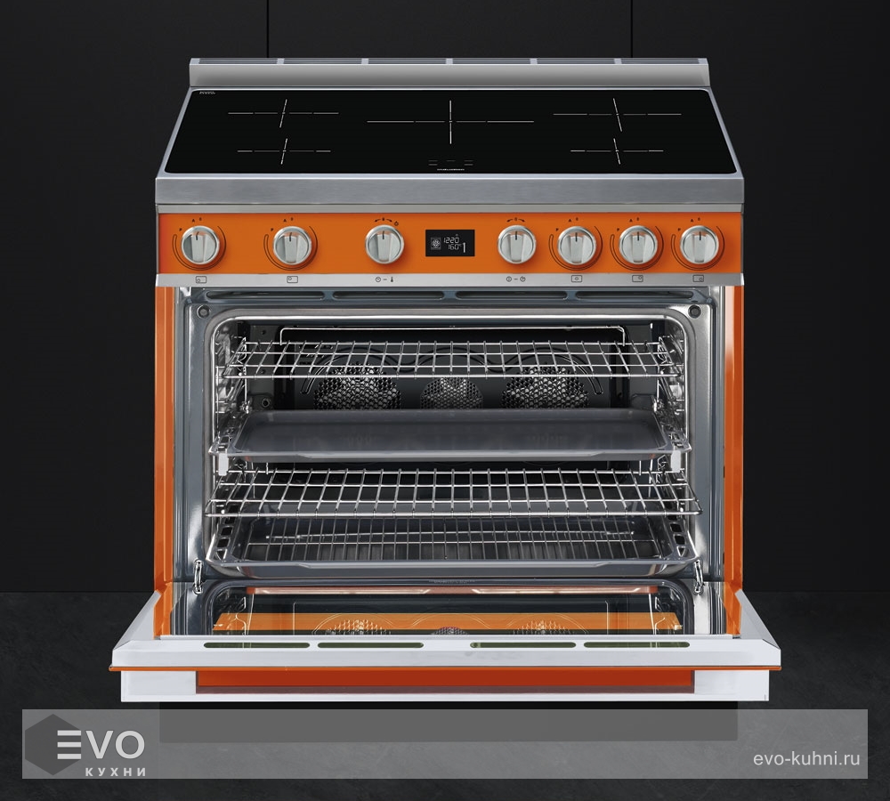 Плита кухонная Smeg CPF9IPOR – плита включает в себя индукционную варочную поверхность из стеклокерамики с 5-ю конфорками, функцией Booster для увеличения мощности и духовой шкаф объемом 115 литров с 5 уровнями приготовления, оснащена системой плавного закрывания Soft Close.
