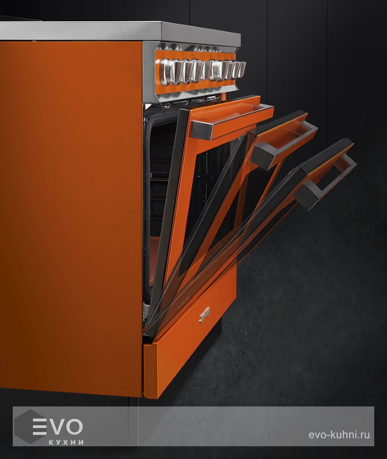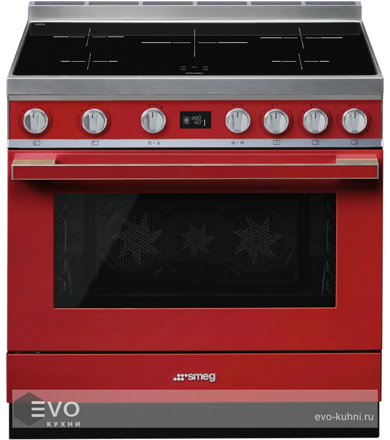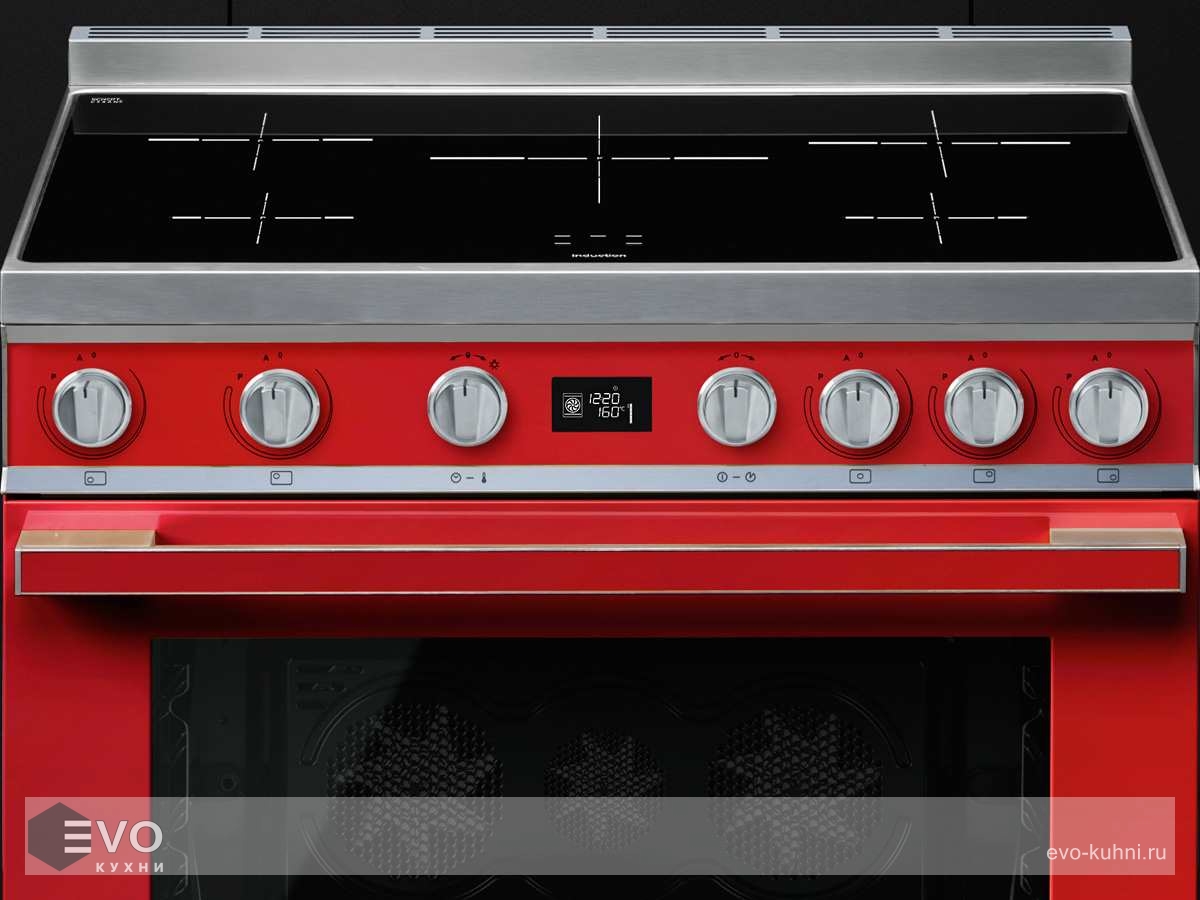 Плита кухонная Smeg CPF9IPR – плита включает в себя индукционную варочную поверхность из стеклокерамики с 5-ю конфорками, функцией Booster для увеличения мощности и духовой шкаф объемом 115 литров с 5 уровнями приготовления, оснащена системой плавного закрывания Soft Close.