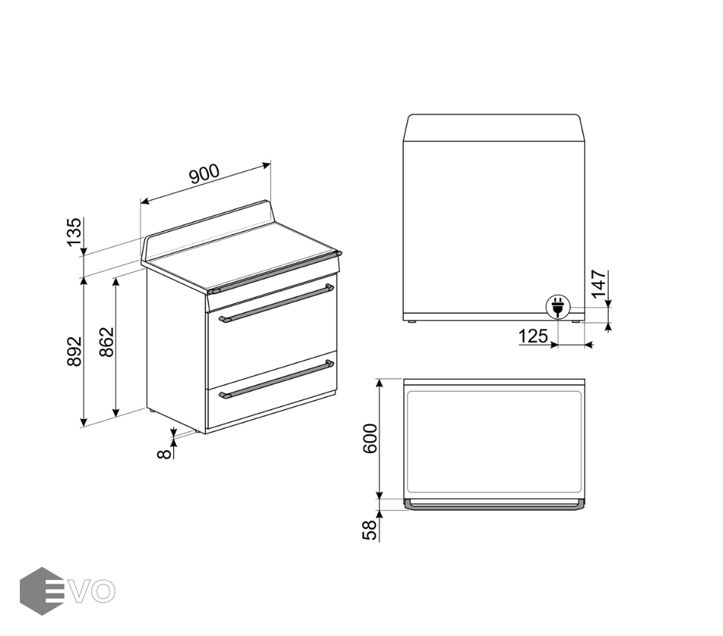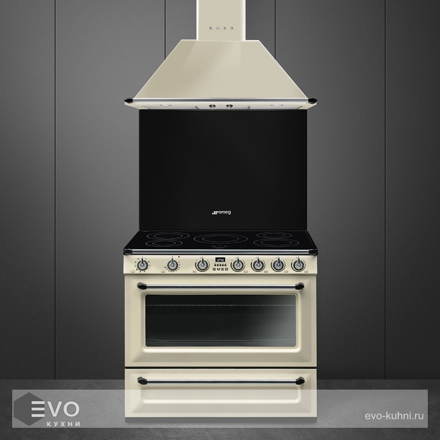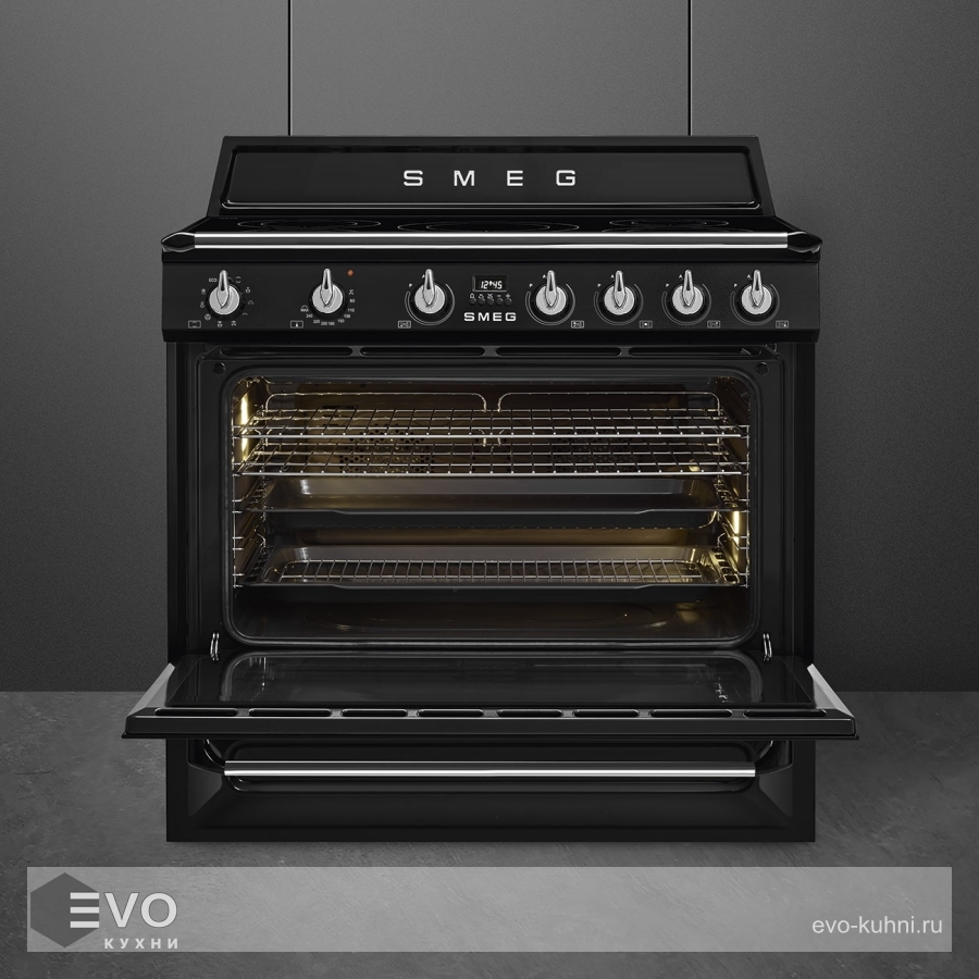 Плита кухонная Smeg TR90IP9 – плита включает в себя индукционную варочную поверхность из стеклокерамики с 5 зонами нагрева, функцией Booster для увеличения мощности и духовой шкаф объемом 115 литров с 5 уровнями приготовления, которая оснащена системой плавного закрывания Soft Close. Варочная поверхность отключается при перегреве, автоматически определяет диаметр посуды. В плите предусмотрен нижний выдвижной ящик для хранения кухонной утвари.