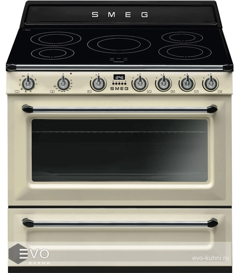 Плита кухонная Smeg TR90IP9 – плита включает в себя индукционную варочную поверхность из стеклокерамики с 5 зонами нагрева, функцией Booster для увеличения мощности и духовой шкаф объемом 115 литров с 5 уровнями приготовления, которая оснащена системой плавного закрывания Soft Close. Варочная поверхность отключается при перегреве, автоматически определяет диаметр посуды. В плите предусмотрен нижний выдвижной ящик для хранения кухонной утвари.