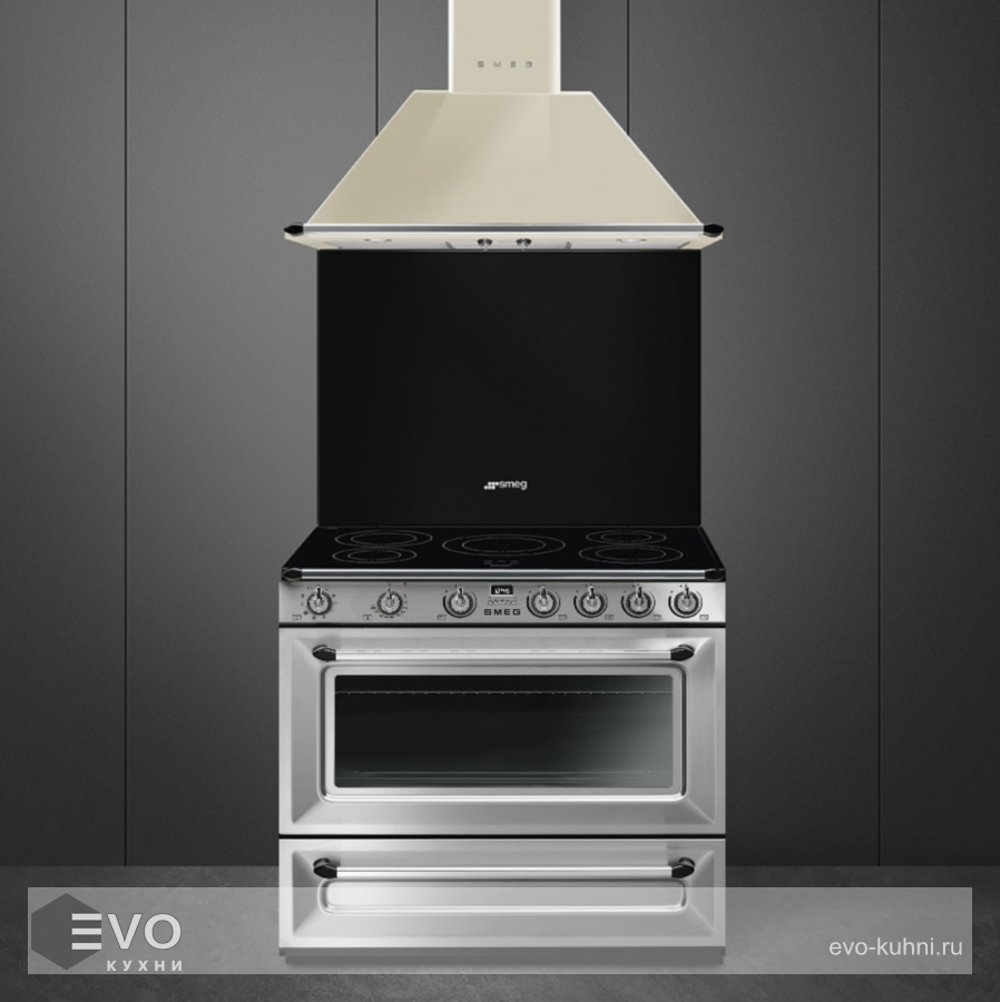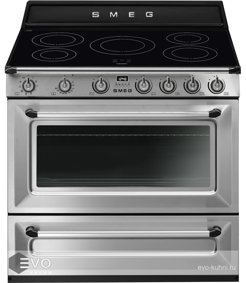 Плита кухонная Smeg TR90IX9-1 – плита включает в себя индукционную варочную поверхность из стеклокерамики с 5 зонами нагрева, функцией Booster для увеличения мощности и духовой шкаф объемом 115 литров с 5 уровнями приготовления, которая оснащена системой плавного закрывания Soft Close. Варочная поверхность отключается при перегреве, автоматически определяет диаметр посуды. В плите предусмотрен нижний выдвижной ящик для хранения кухонной утвари.