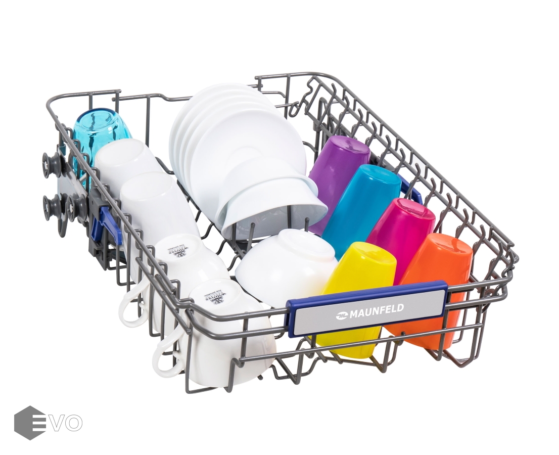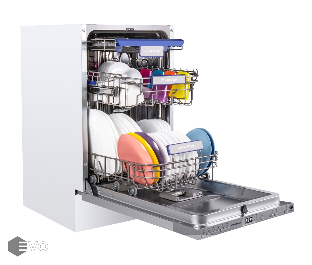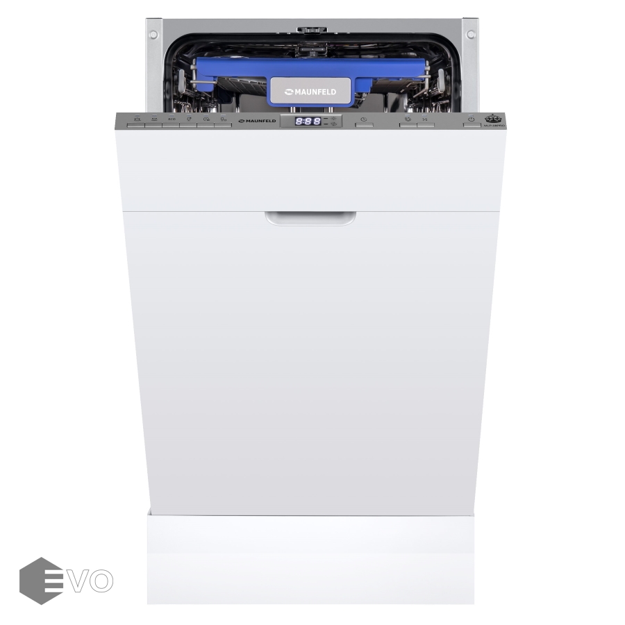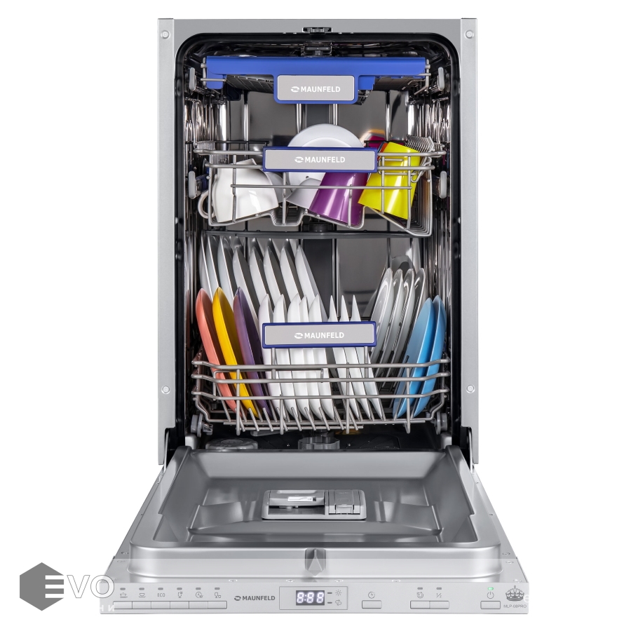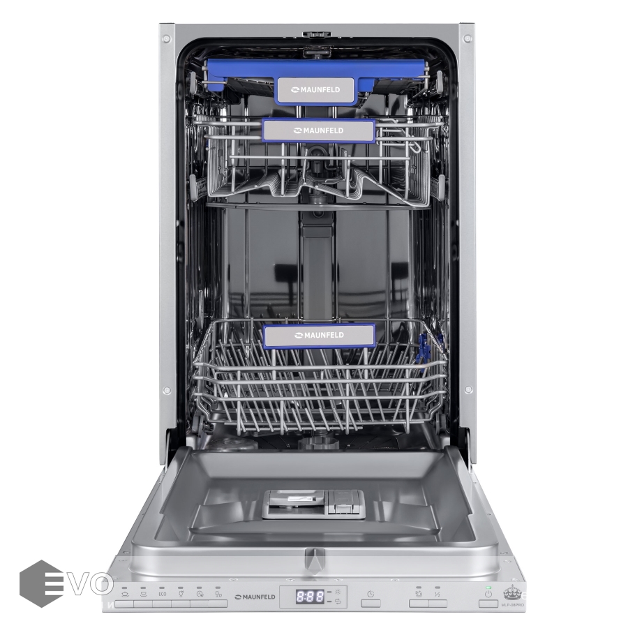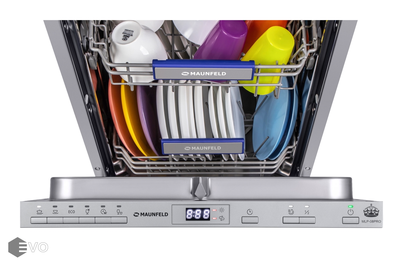 Посудомоечная машина MAUNFELD MLP-08PRO – узкая встраиваемая посудомоечная машина шириной 45 см. Благодаря использованию специально разработанных корзин и дополнительного выдвижного лотка для столовых приборов позволяет вымыть 10 комплектов посуды. Внутренняя поверхность выполнена из нержавеющей стали толщиной 0.6-0.8 мм, что обеспечит долгий срок службы при активном использовании. Электронное управление с дисплеем расположено в торце загрузочной дверцы.