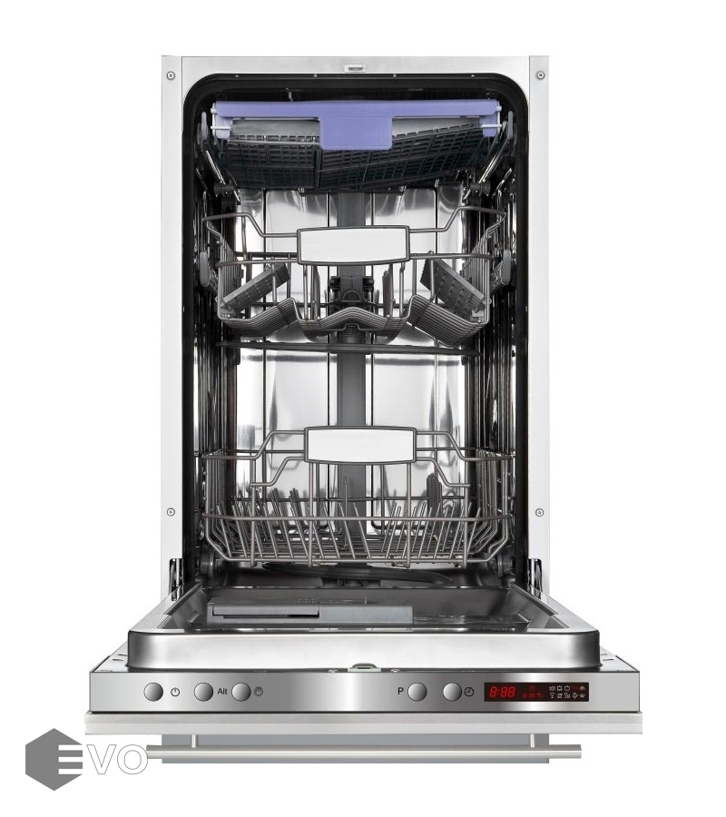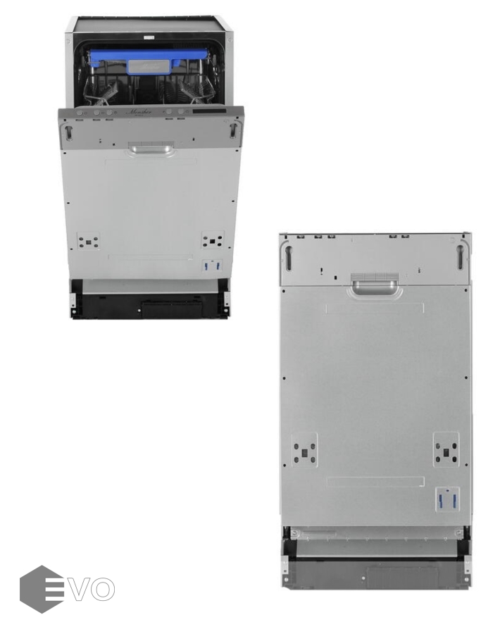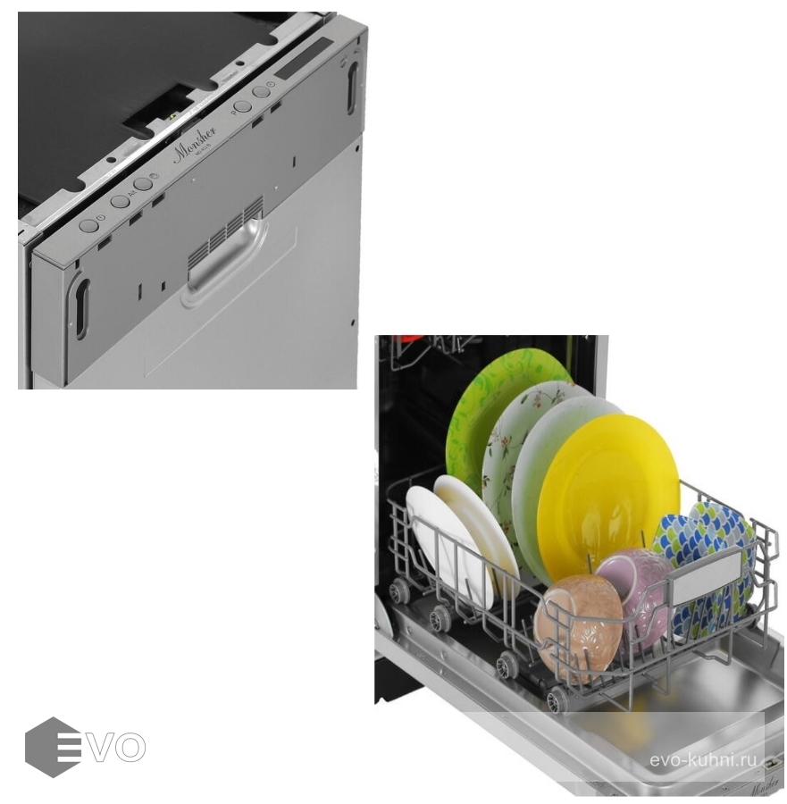 Встраиваемая посудомоечная машина MONSHER MD 452 B обладает отличным набором функций. При ширине 45 см она вмещает в себя до десяти комплектов посуды, что означает заполнение раз в день в семье из 3-4 человек. Третья корзина для столовых приборов, расположенная вверху, освобождает место внизу.
