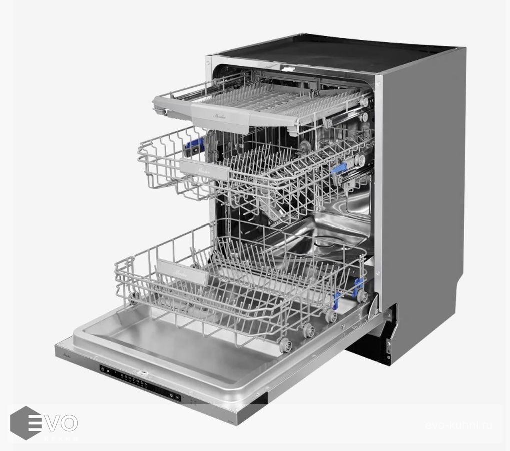 Посудомоечная машина оснащена тремя вместительными корзинами и держателем для бокалов.