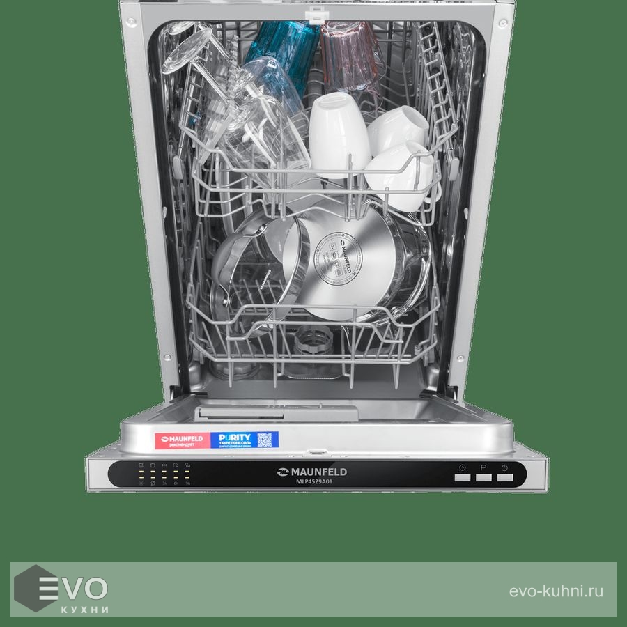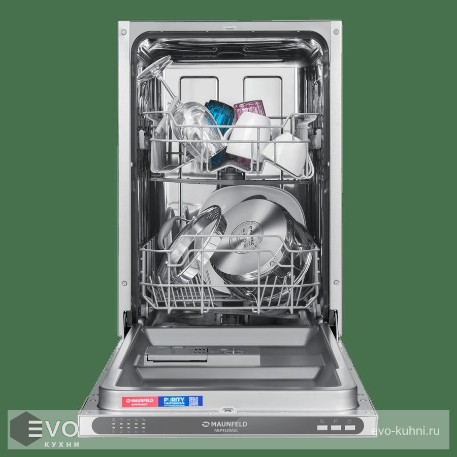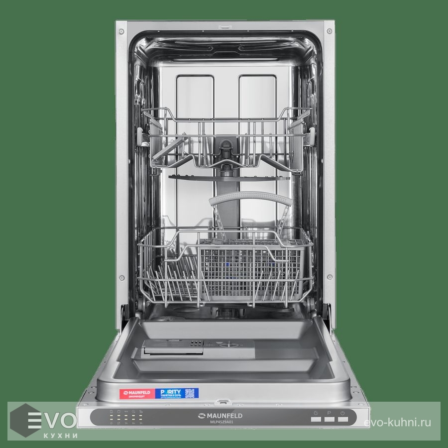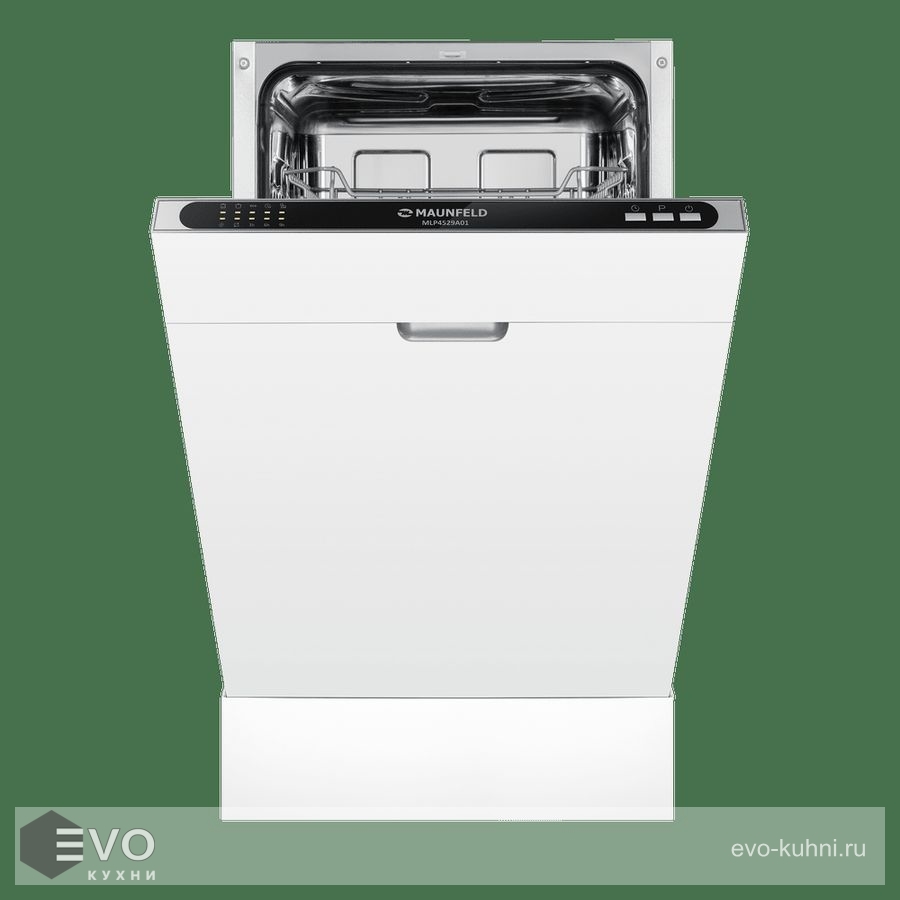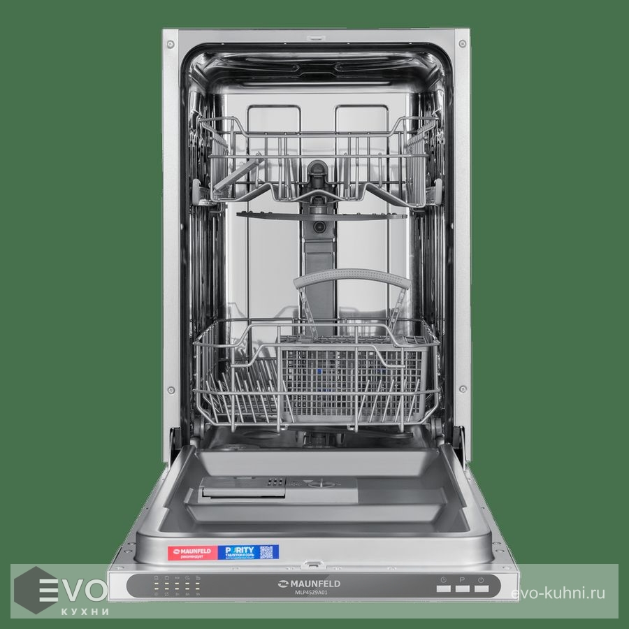 MAUNFELD MLP4529A01 — это узкая модель, шириной 45 см (вместо классических 60 см), но весьма вместительная. За раз она может вымыть до 9 комплектов — это оценят в больших семьях, а также те, кто любит готовить, часто принимает гостей. MLP4529A01 избавит вас от необходимости мыть посуду вручную.
