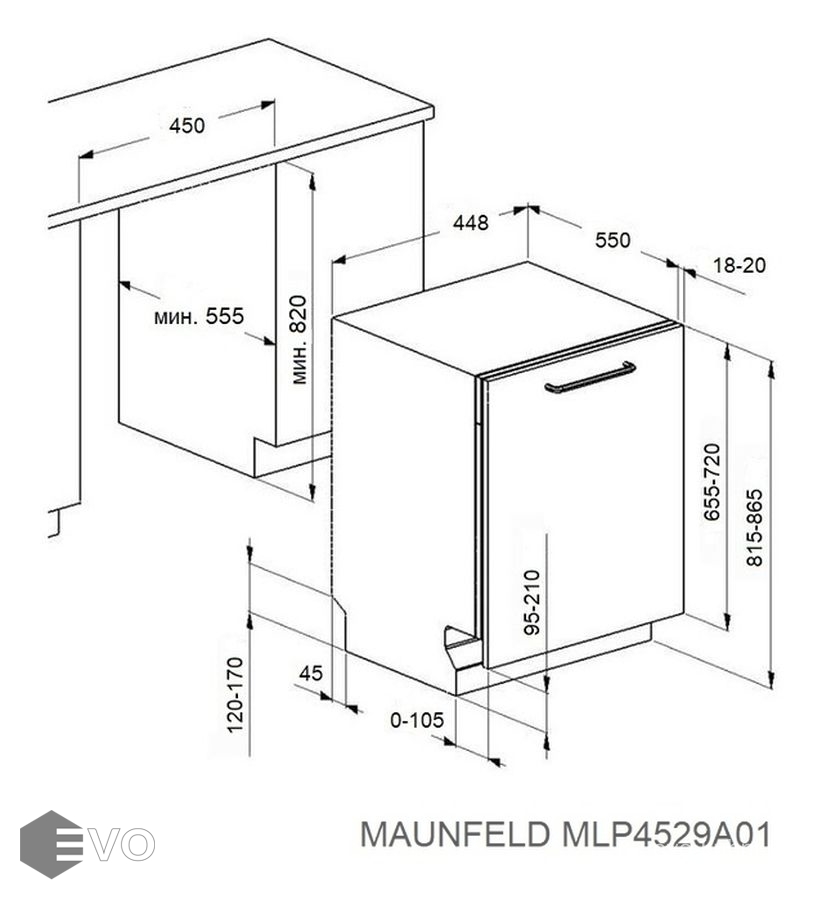 Размеры встраивания (ВхШхГ), мм: 820х450х555 мм
