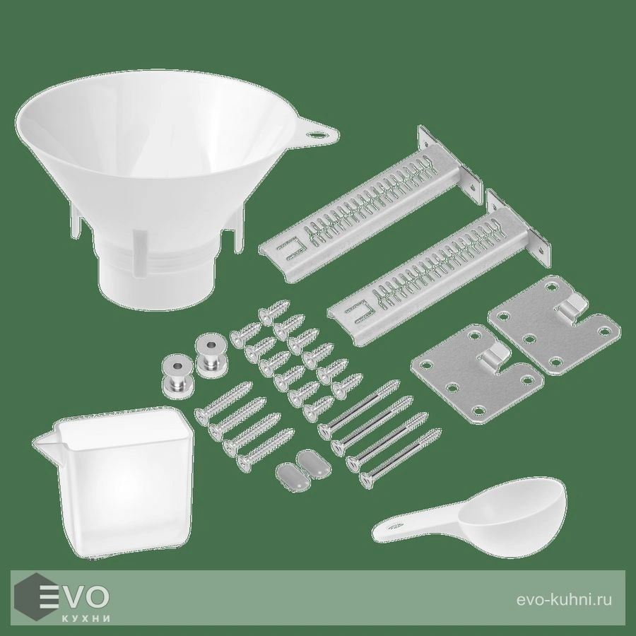 • В комплекте: корзина для столовых приборов,воронка для соли, мерная ложечка, мерный стаканчик, установочный комплект