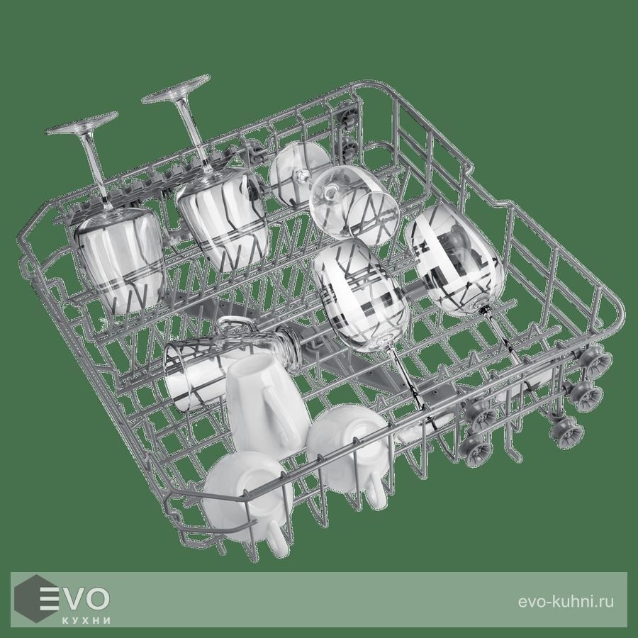 В машине максимально эффективно организовано внутреннее пространство. Есть удобная корзина для столовых приборов и мелкой утвари. Верхняя корзина — с изменяемой высотой установки, чтобы можно было мыть посуду разного размера и объёмов. В верхней корзине есть складные держатели для бокалов — дополнительное важное удобство.