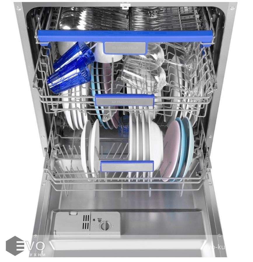 Полноразмерная (ширина 60 см) встраиваемая посудомоечная машина MAUNFELD МLP-12B вмещает до 14 комплектов посуды. Можно мыть также большие кастрюли и сковородки благодаря переставляемой по высоте верхней корзине.