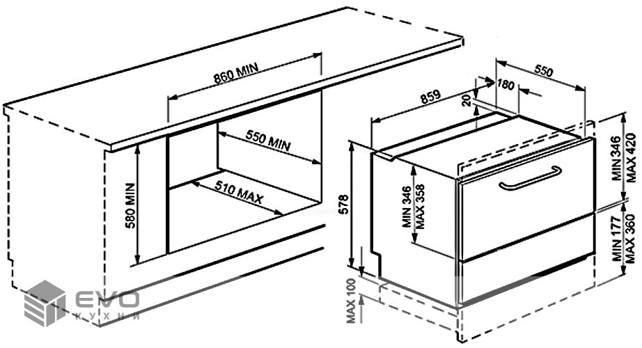 Размеры встраивания (ВхШхГ), мм: 580х860х510-550