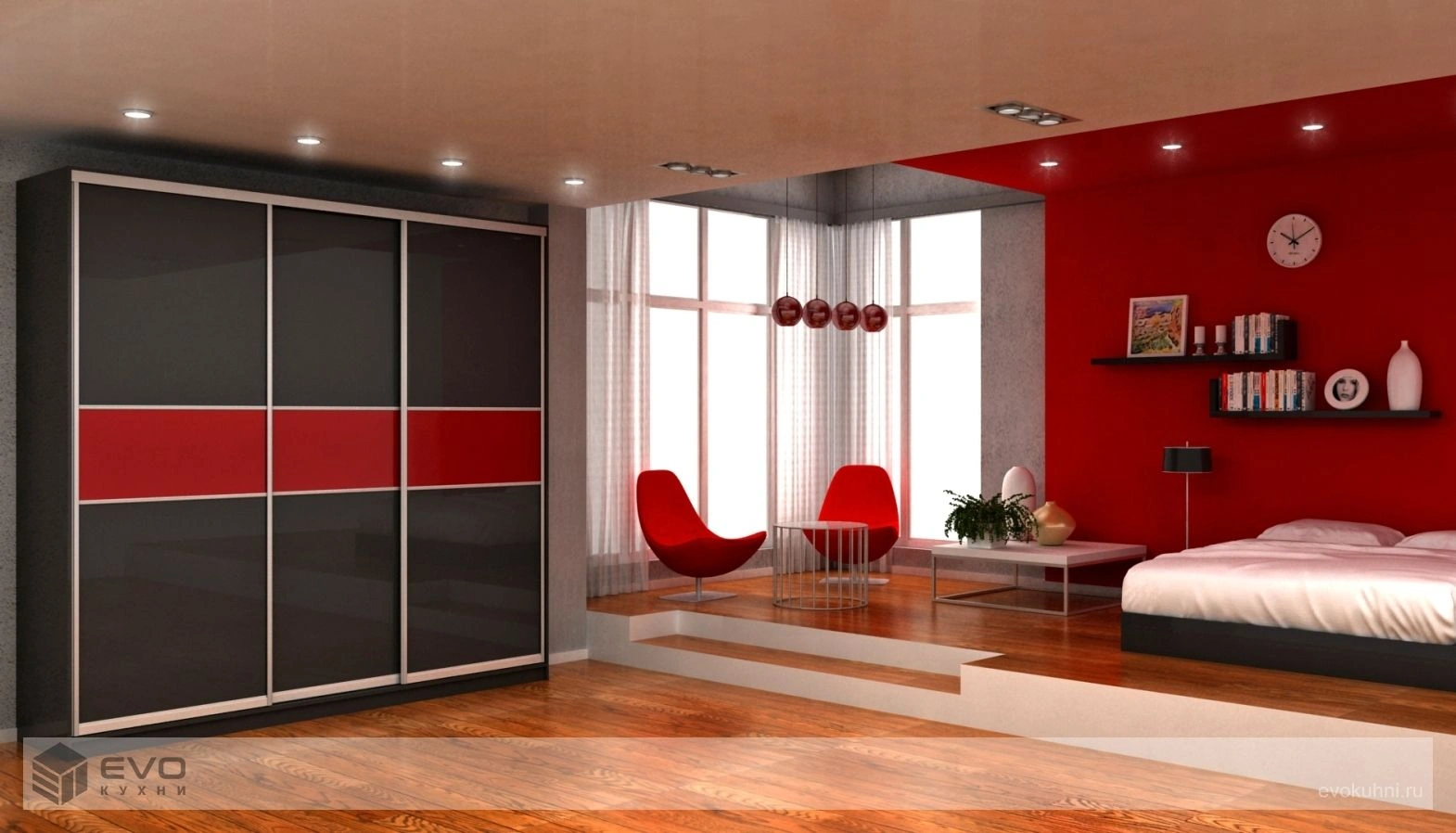 Шкаф-купе 3 двери черное стекло с красной вставкой
