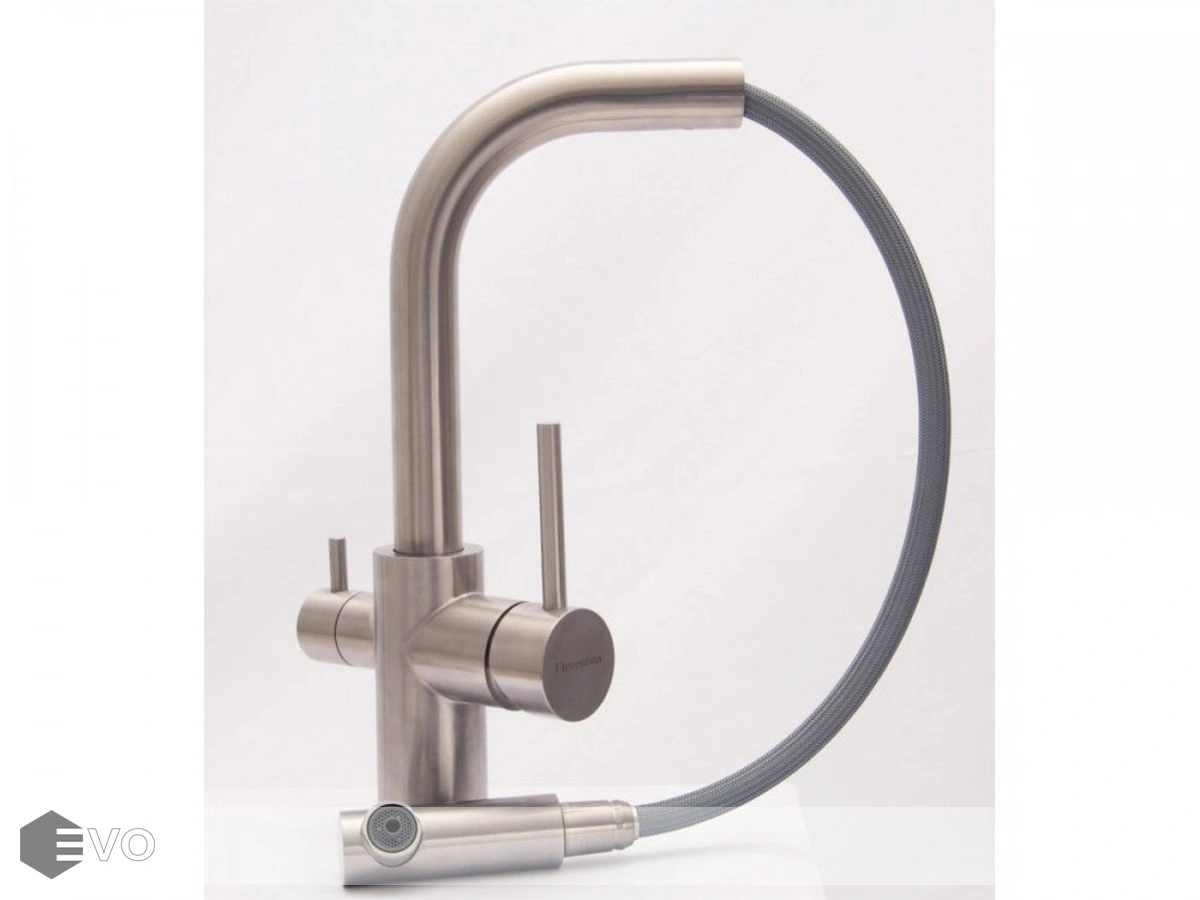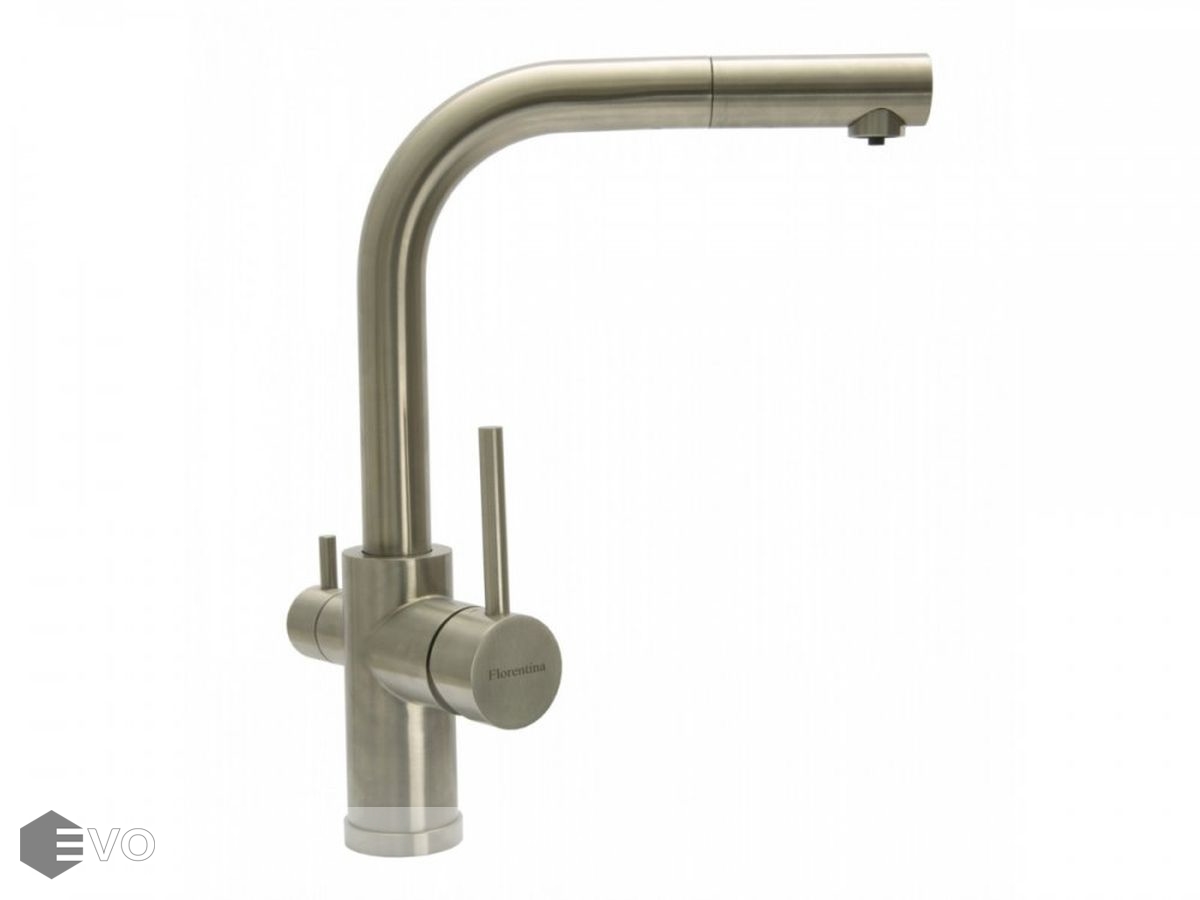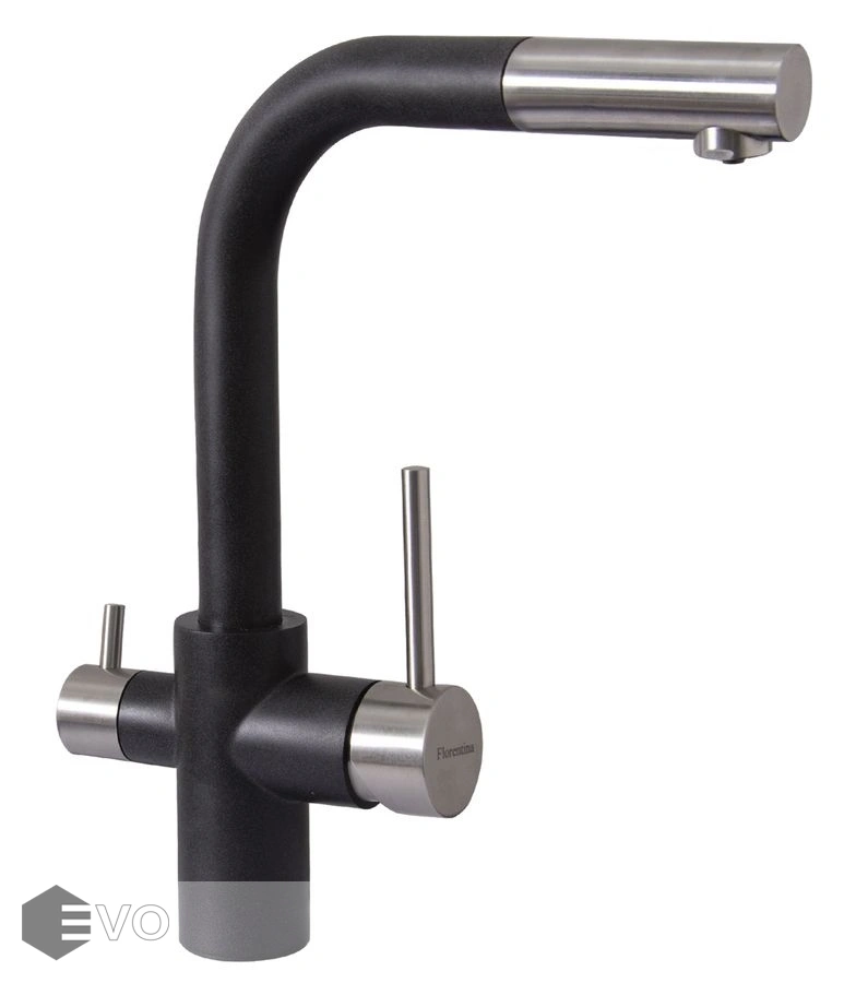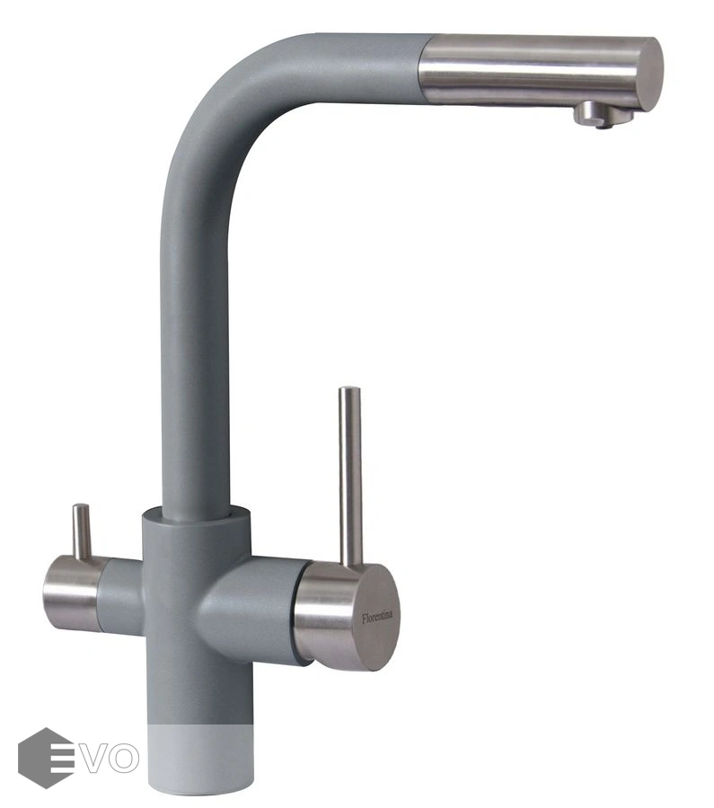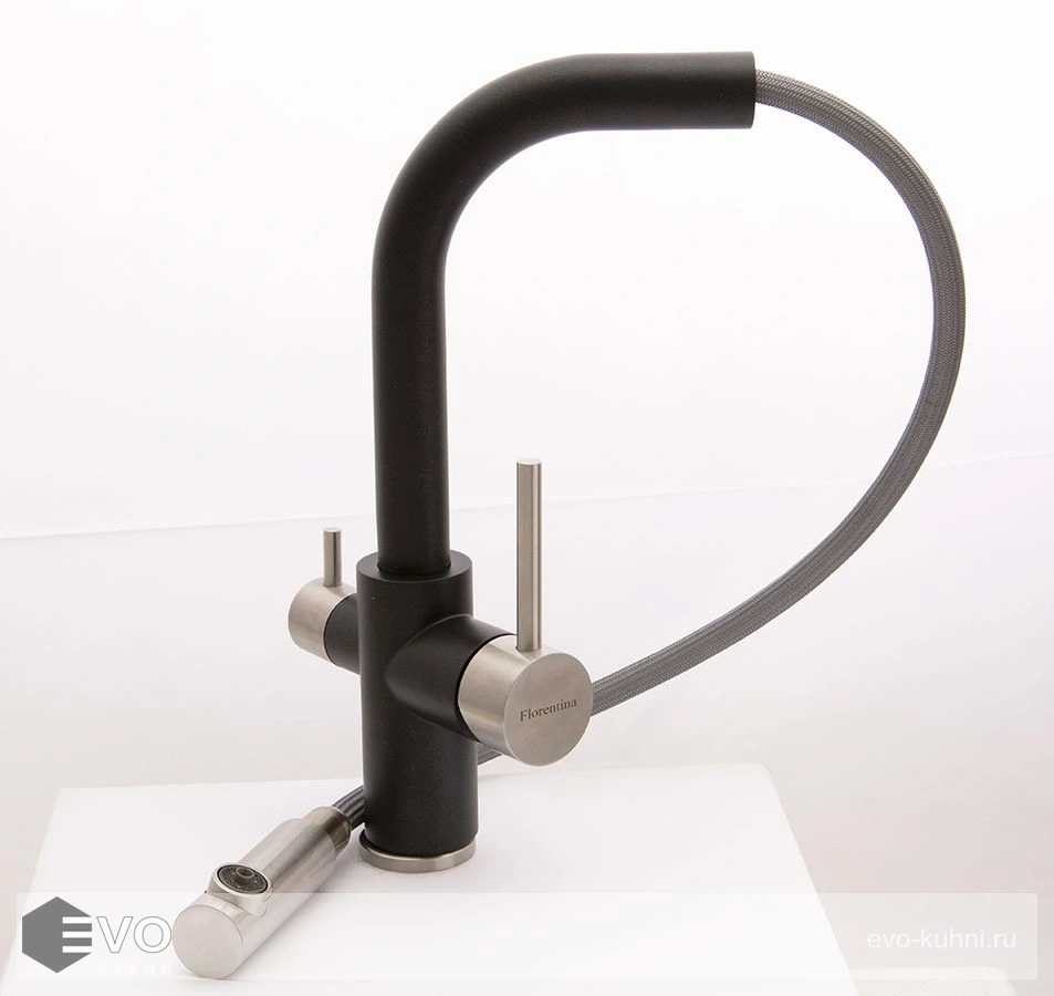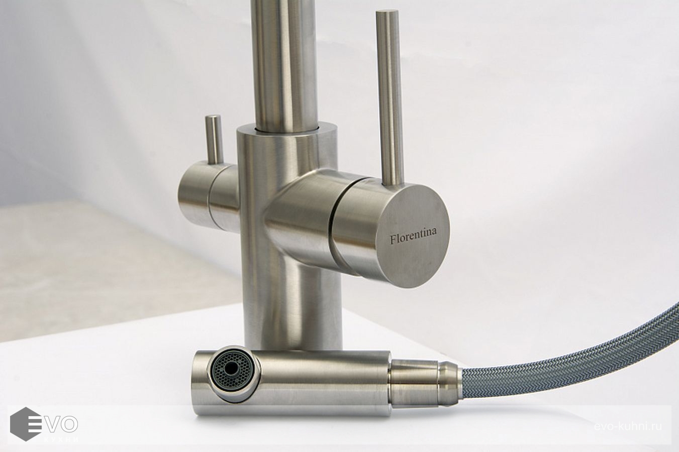 Модель три в одном – подключение к фильтру, выдвижной душ, стандартная регулировка подачи воды.