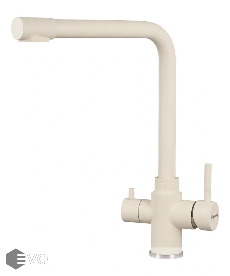 Модель оснащена подключением к фильтру с питьевой водой и рычагом, обеспечивающим контроль и точность при выборе напора и температуры воды.