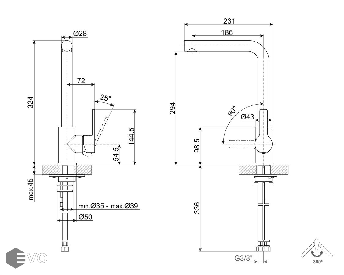 Благодаря поворотному изливу модель может быть установлена на край мойки и подходит для раковин с двумя чашами.