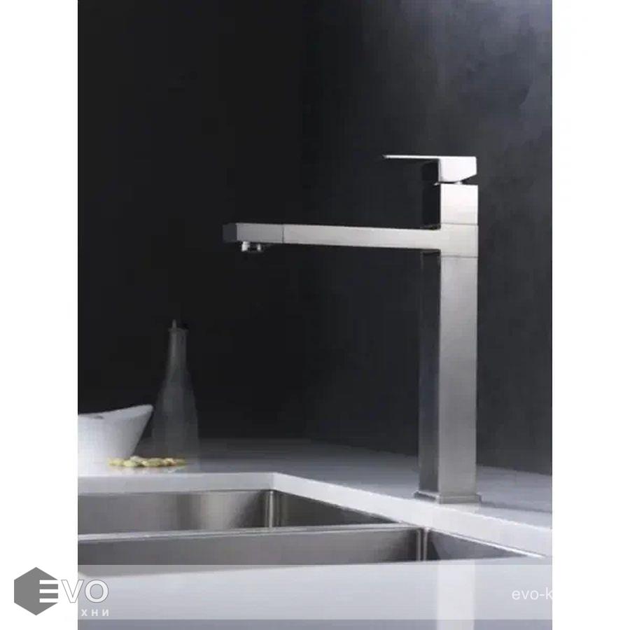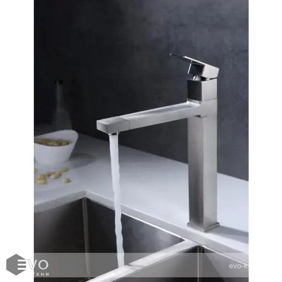 Имеет удобную ручку для регулировки подачи потока воды. Дизайн смесителя сделан в стиле хай тек.