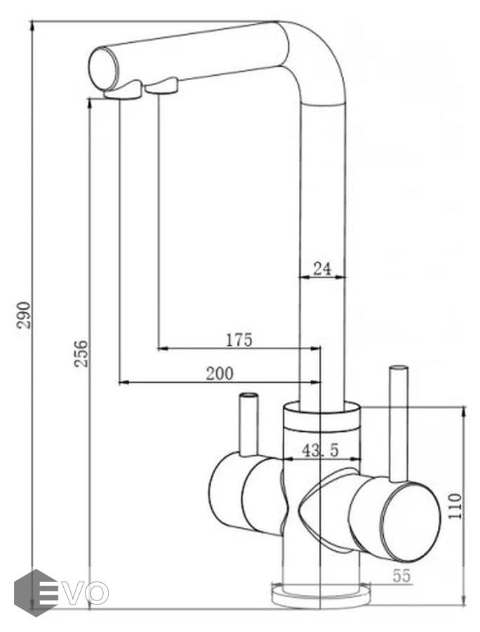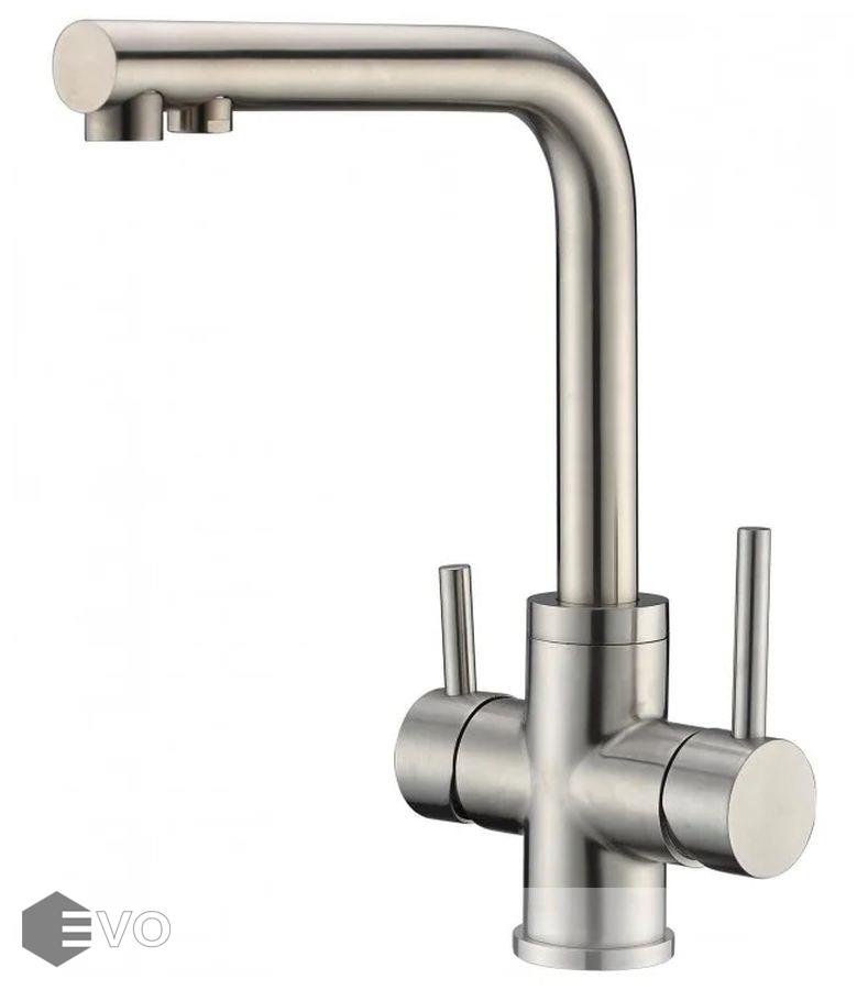 Смеситель обладает основной ручкой для подачи проточной воды и дополнительной ручкой для подачи воды из питьевого фильтра. Подключение к фильтру очистки воды стандартное.
