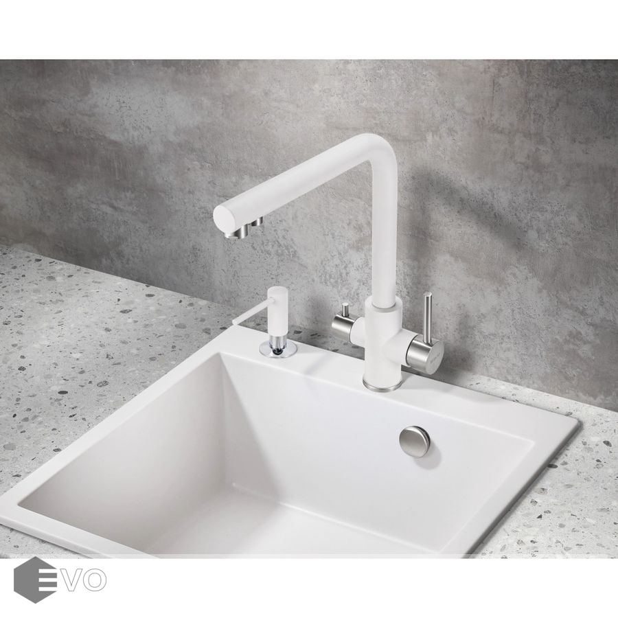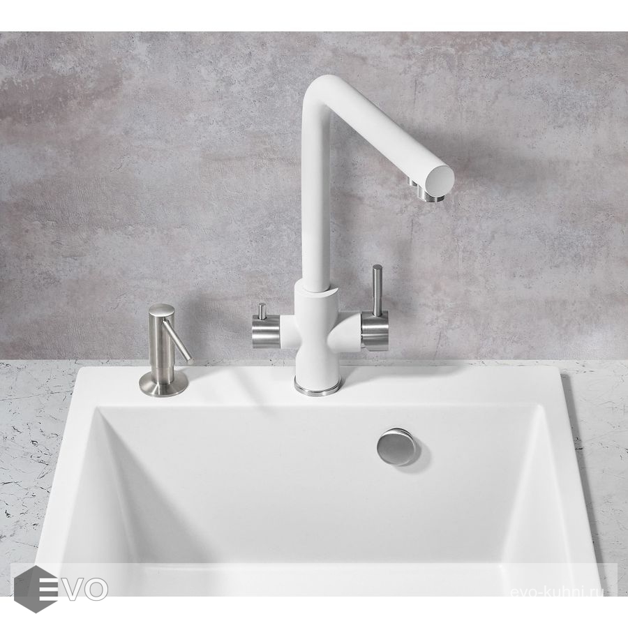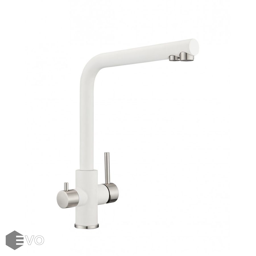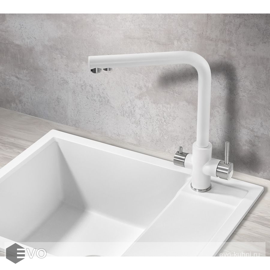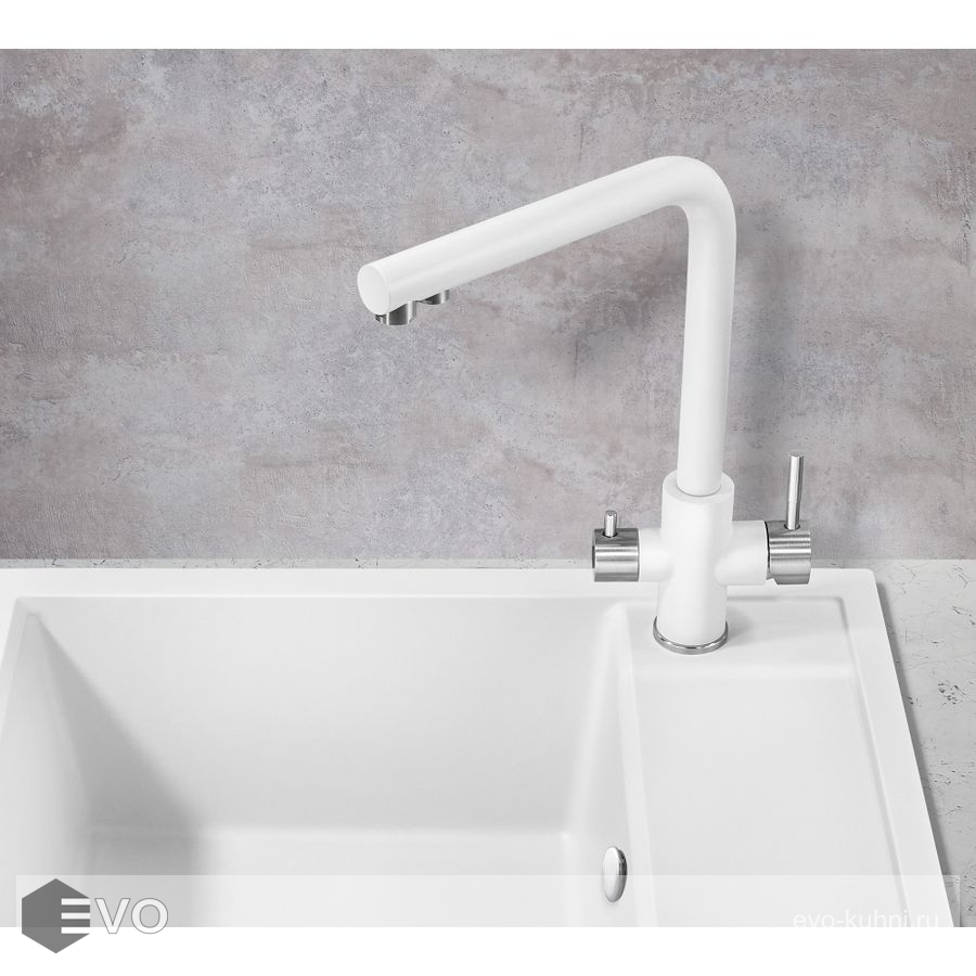 Один кран совмещает в себе две функции: подача воды для бытовых нужд + подача фильтрованной воды для питья. Два независимых друг от друга канала не только исключают возможность перекрестного смешивания воды, но и избавляют от необходимости устанавливать дополнительный кран для фильтра, что освобождает рабочее пространство и не перегружает общий вид кухни. Простая регулировка подачи обычной и питьевой воды осуществляется с помощью двух обособленных рычагов, установленных на одном корпусе (один рычаг — для бытовой воды, второй — для фильтрованной). Гибкая подводка идет в комплекте.