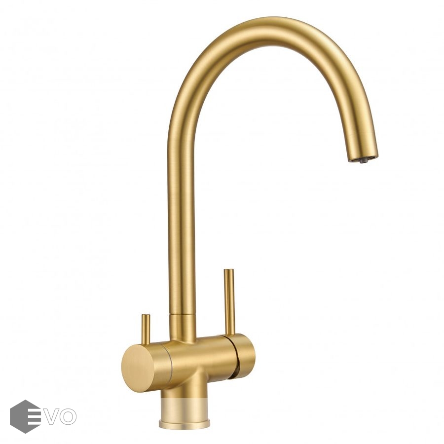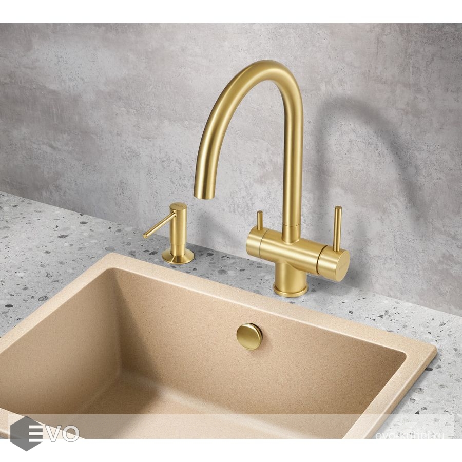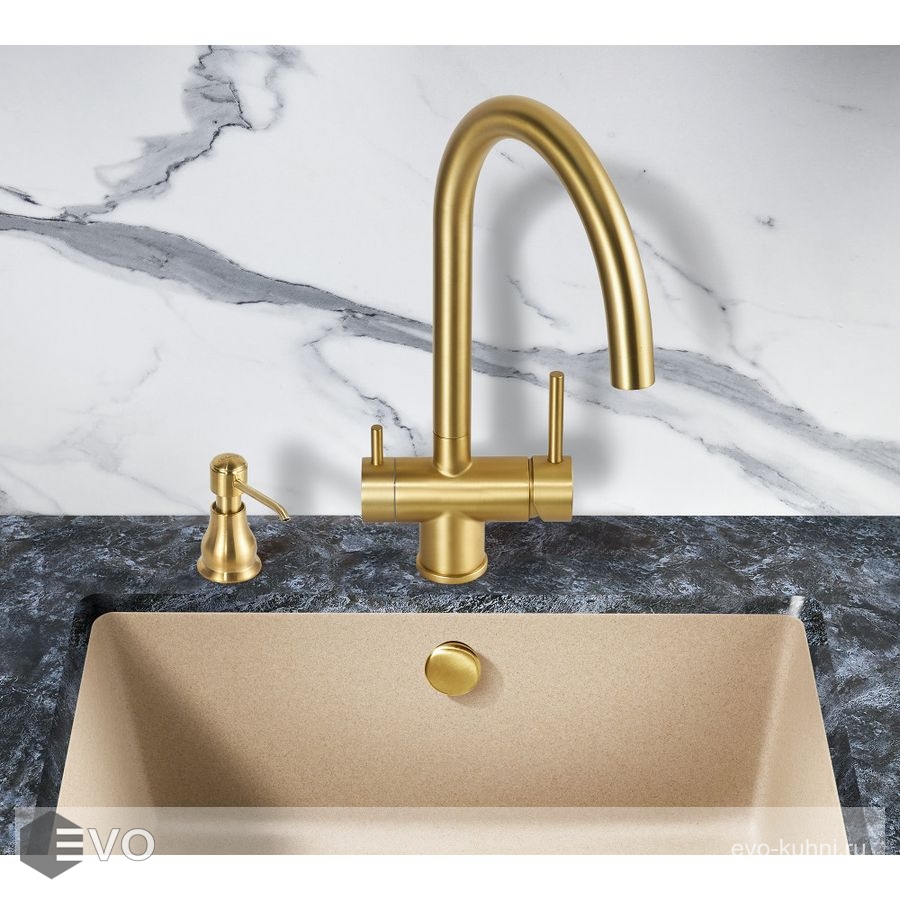 Модель выполнена в цвете роскошного брашированного золота и имеет изящный изогнутый кран, благодаря чему станет яркой, привлекающей внимание деталью на кухне и никого не оставит равнодушным.