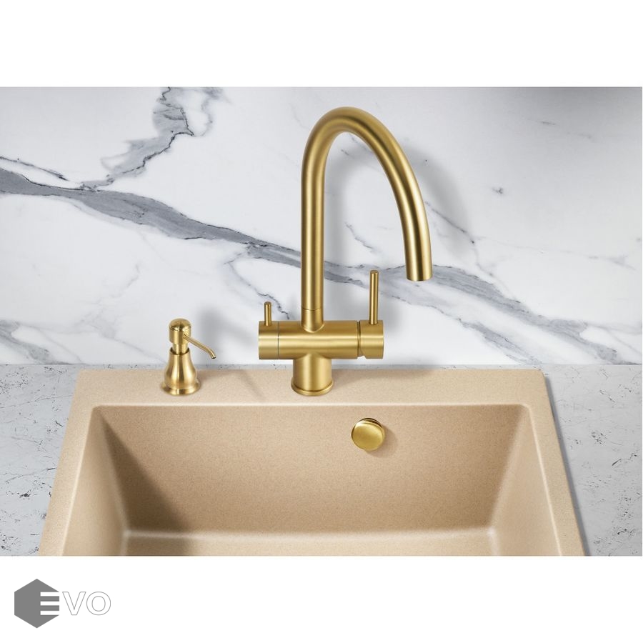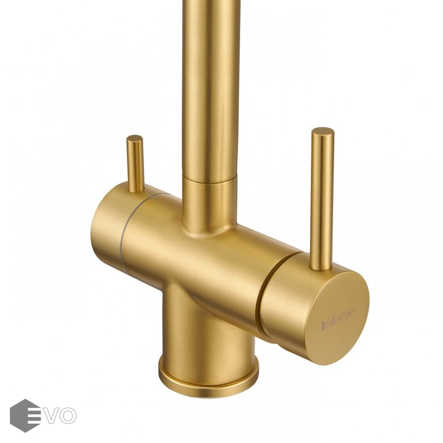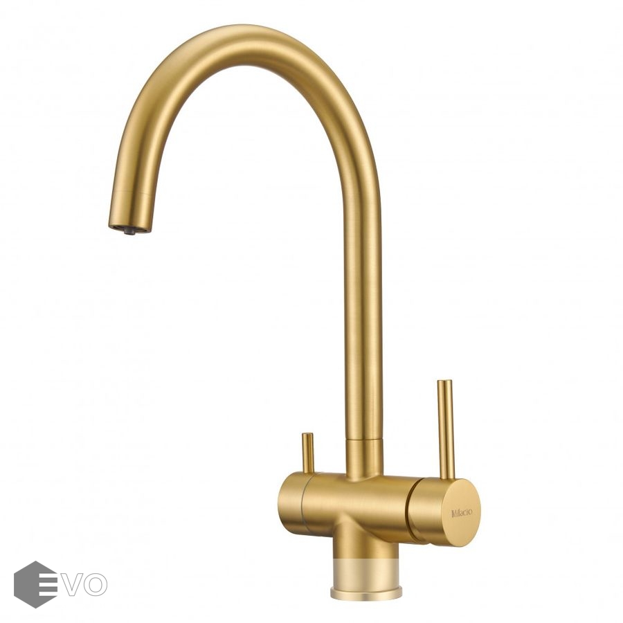 Смеситель для кухонной мойки Milacio Ultra (MCU.554.GD) из нержавеющей стали с PVD покрытием в цвете сатинированное золото, с возможностью подключения фильтра — стильное и высокофункциональное решение, которое выгодно подчеркнет все достоинства вашей кухни.