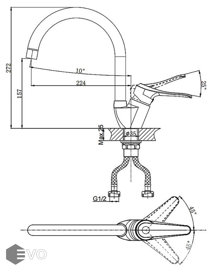- Угол поднятия рычага: 25°