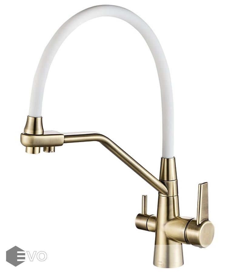 Комбинированный смеситель для кухонной мойки 2 в 1 для кухни модель SH 903-8 бронза/белый представляет коллекцию смесителей Steel Hammer. Эта модель производится из латуни с последующим приданием поверхности смесителя благородного цвета бронзового оттенка. При изготовлении применяется технология PVD-покрытия. Такое покрытие нанесено специальным способом и не стирается по прошествии времени. Оригинальный классический дизайн в совокупности с удобными размерами кухонного смесителя позволяет использовать его в полной мере. Прекрасно гармонирует с гранитными кухонными мойками других производителей.