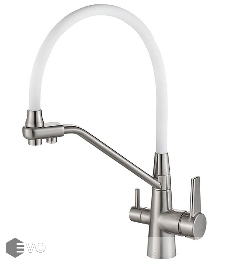 В смесителе применена технология "двойного канала", которая позволяет подключить питьевой фильтр сразу к смесителю. Вода подается не смешиваясь по разным каналам. Рукоятка управления водопроводной водой находится справа от носика, управление питьевой водой - слева.