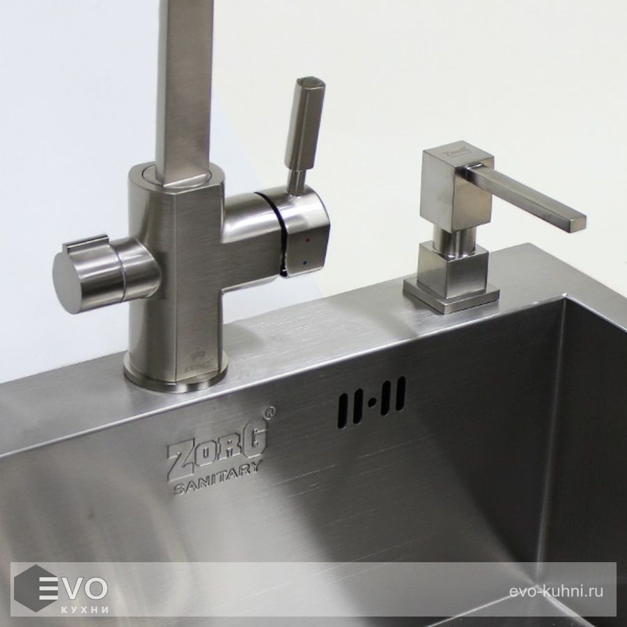 Технология комбинированного смесителя ZORG два в одном позволяет получать водопроводную и очищенную воду из одного смесителя. Благодаря "двойному каналу" в изливе смесителя, вода подается не смешиваясь по разным каналам. Рычаг управления водопроводной водой справа, питьевой - слева.
