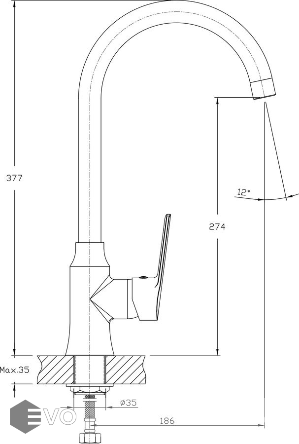 Аэратор изготовлен из пластика с нержавеющим корпусом, угол наклона аэратора- 12 гр.