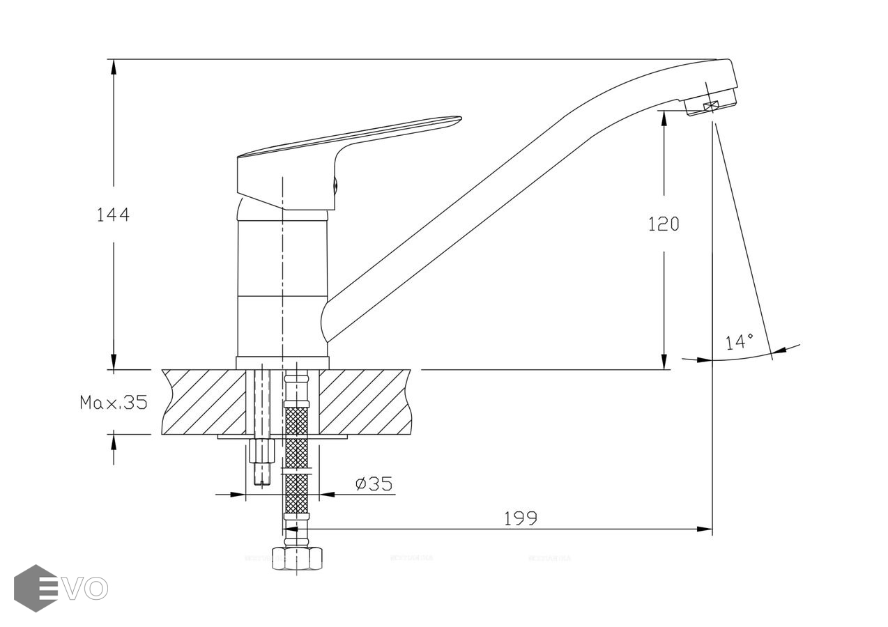 Излив поворотный 360 гр, 199 мм. Высота излива до аэратора 120 мм. Аэратор изготовлен из пластика с нержавеющим корпусом, угол наклона аэратора- 14 гр.