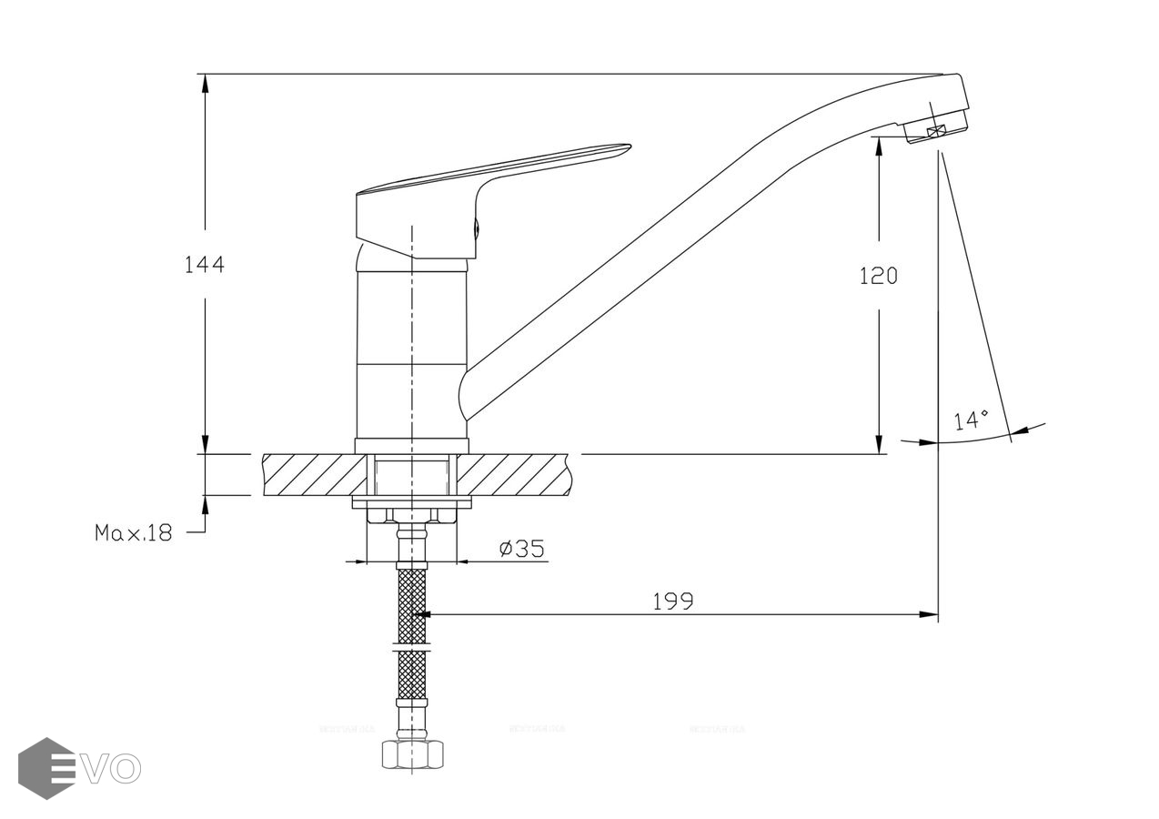 Излив поворотный 360 гр, 199 мм. Высота излива до аэратора 120 мм. Аэратор изготовлен из пластика с нержавеющим корпусом, угол наклона аэратора - 14 гр.
