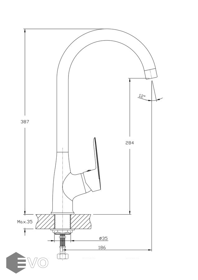 Высота смесителя 387 мм. Излив поворотный 360 гр, 186 мм. Высота излива до аэратора 284 мм. Аэратор изготовлен из пластика с нержавеющим корпусом, угол наклона аэратора - 12 гр. В комплекте гибкая подводка с латунными гайками 35 см - 2 шт., присоединительная гайка S-32 (34) мм., фтулка-31 мм, фум-лента, индивидуальный пакет, паспорт, гарантийный талон.