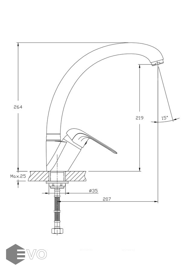 Высота смесителя 264 мм. Излив поворотный 360 гр, 207 мм. Высота излива до аэратора 219 мм. Аэратор изготовлен из пластика с нержавеющим корпусом, угол наклона аэратора- 15 гр. В комплекте гибкая подводка с латунными гайками 35 см - 2 шт., присоединительная гайка S-30 мм, фтулка-27 мм, фум-лента, индивидуальный пакет, паспорт, гарантийный талон.