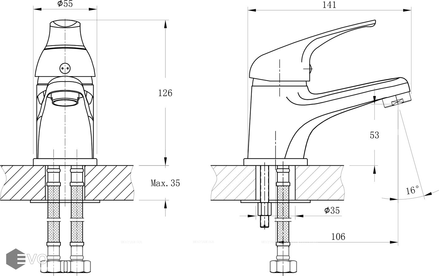 Высота смесителя 126 мм. Излив литой, неповоротный, 106 мм. Высота излива до аэратора 53 мм. Аэратор изготовлен из пластика с нержавеющим корпусом, угол наклона - 16 гр.