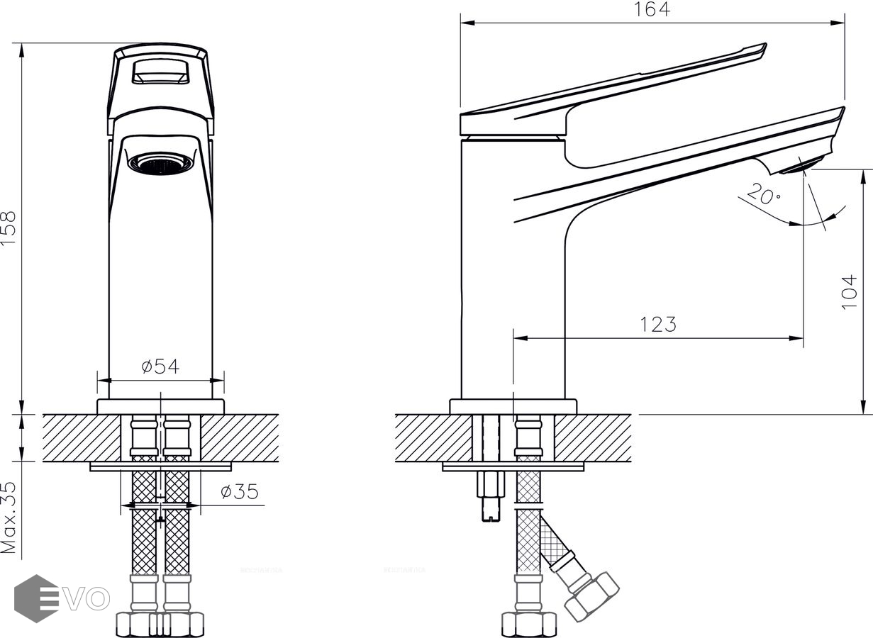 В смеситель установлен картридж D-35 с керамическими пластинами. Высота смесителя 158 мм. Излив литой, неповоротный, 123 мм. Высота излива до аэратора 104 мм.