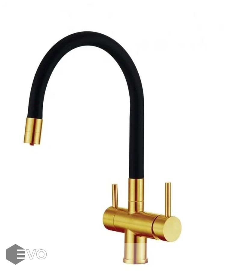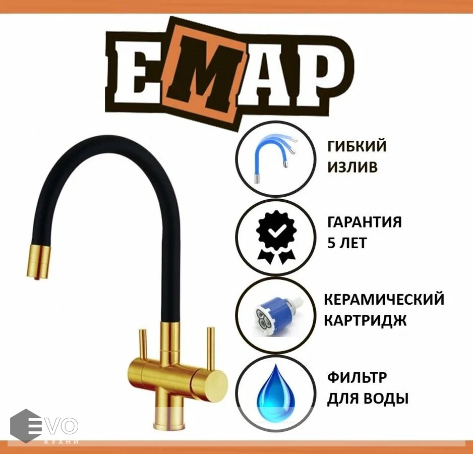 EMAR EC-3015 Golden - современный одноаэраторный кухонный смеситель с краном для питьевой воды и гибким силиконовым изливом.