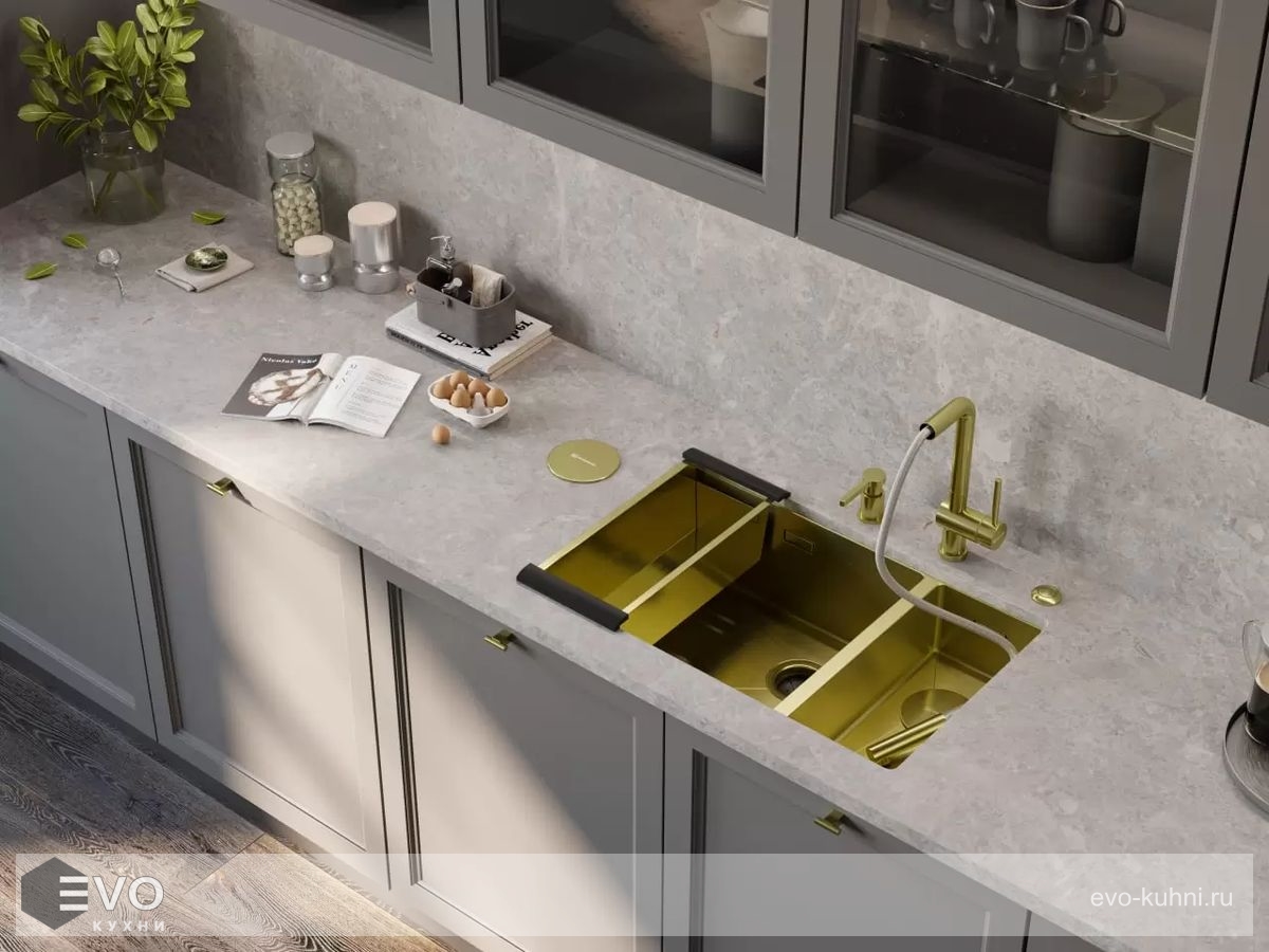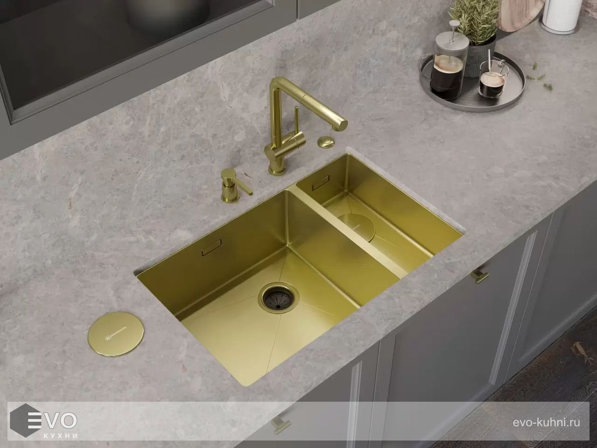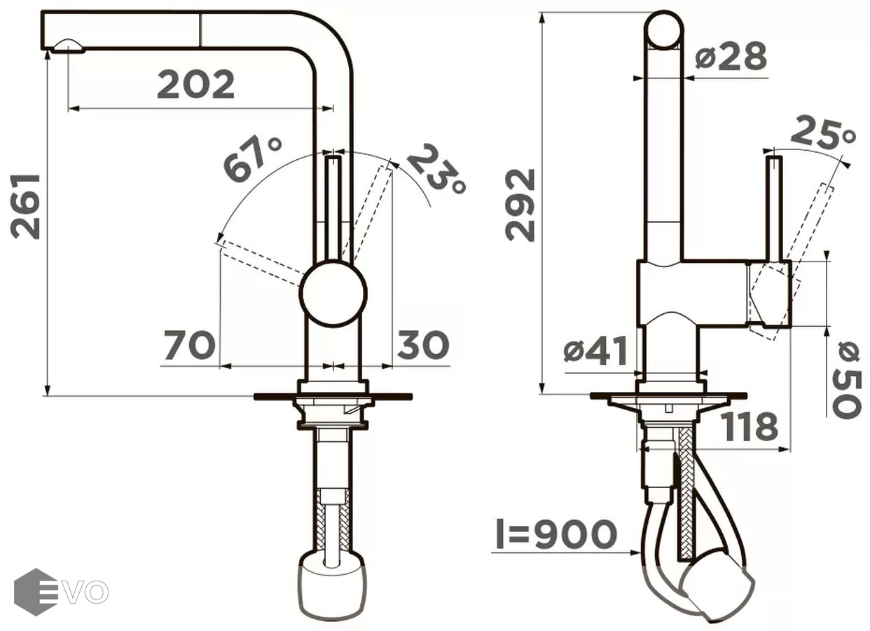 • Практичный однорычажный смеситель выполнен в современном стиле и снабжен высоким поворотным изливом и вытяжным шлангом;