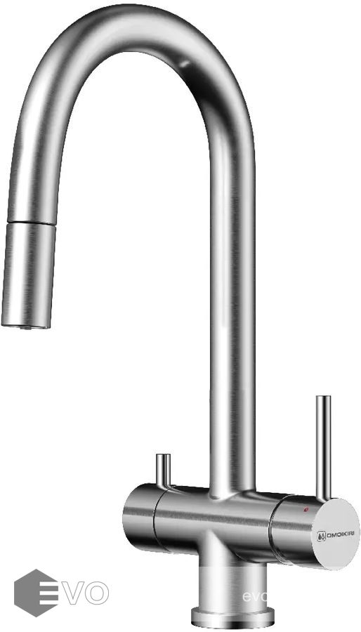- Первый смеситель OMOIKIRI в категории 3 в 1: функция подачи холодной/горячей воды, возможность подключения фильтра для очистки и наличие вытяжного шланга;