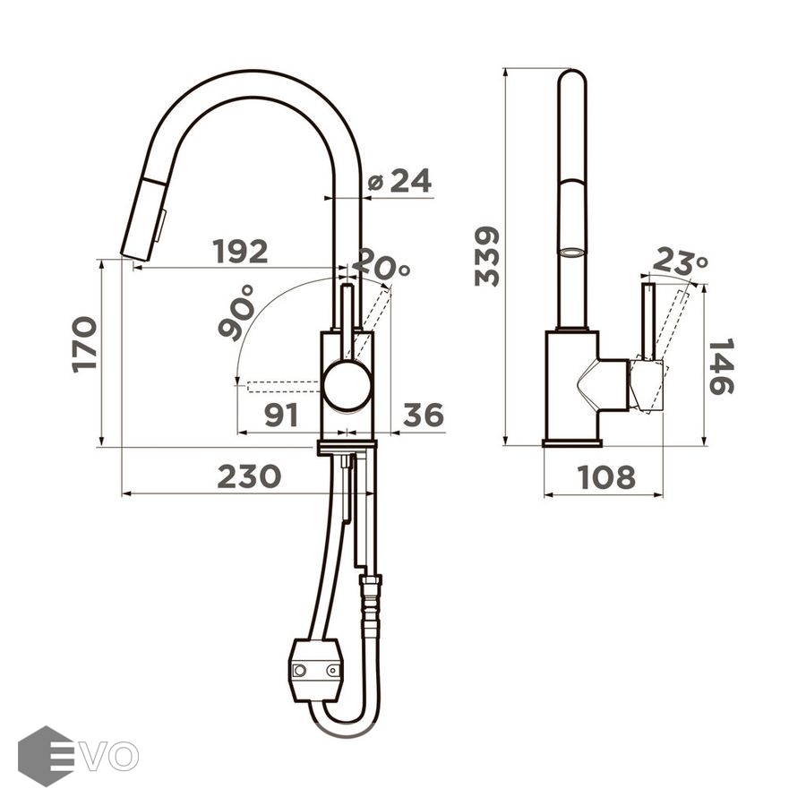 • Особенности: Вытяжной шланг длиной до 400 мм, кнопка струя/душ